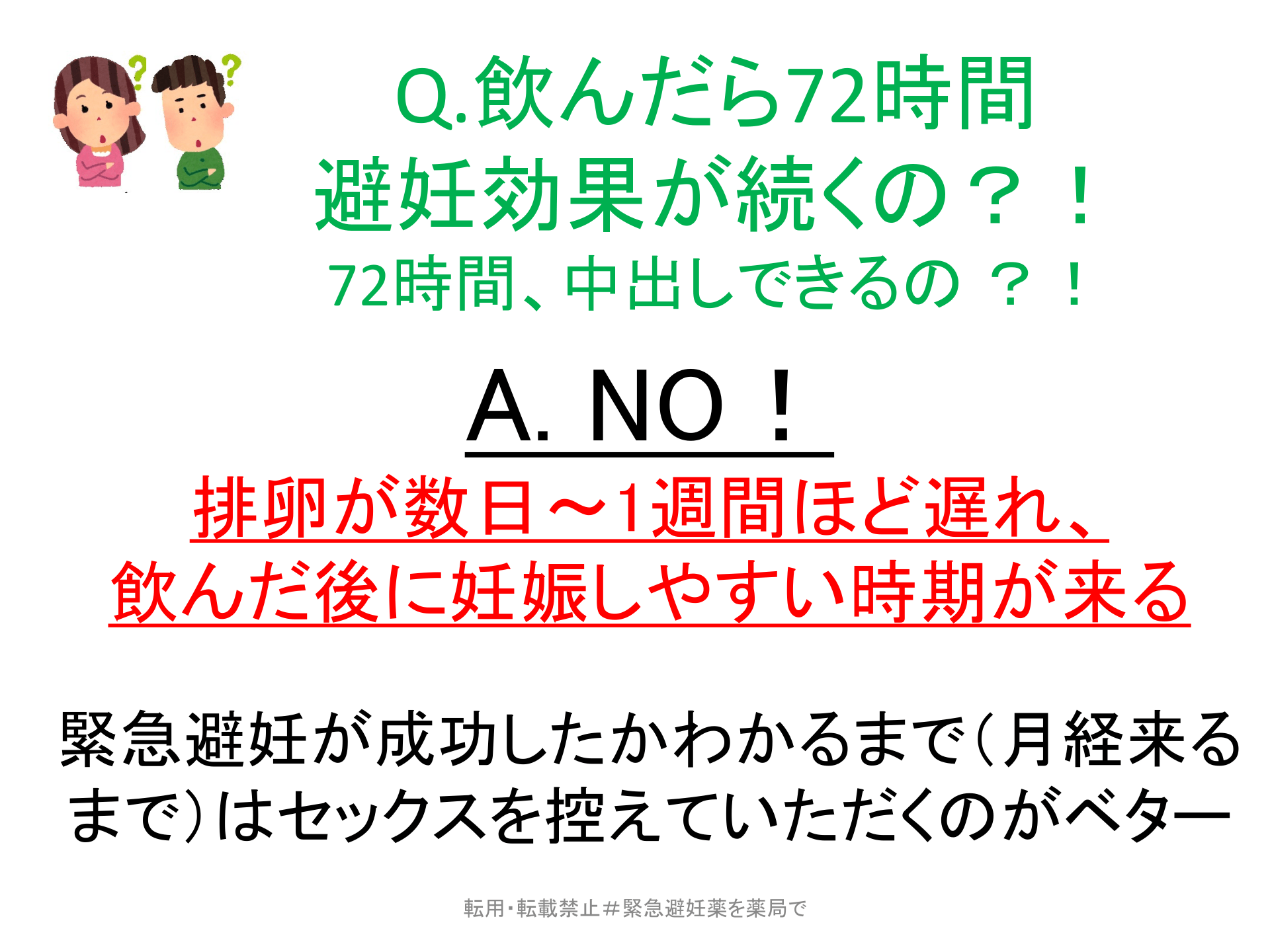 #13. Q.飲んだら72時間 避妊効果が続くの?! 72時間、中出しできるの ?! A. NO! 排卵が数日~1週間ほど遅れ、 飲んだ後に妊娠しやすい時期が来る 緊急避妊が成功したかわかるまで(月経来る まで)はセックスを控えていただくのがベター 転用・転載禁止#緊急避妊薬を薬局で