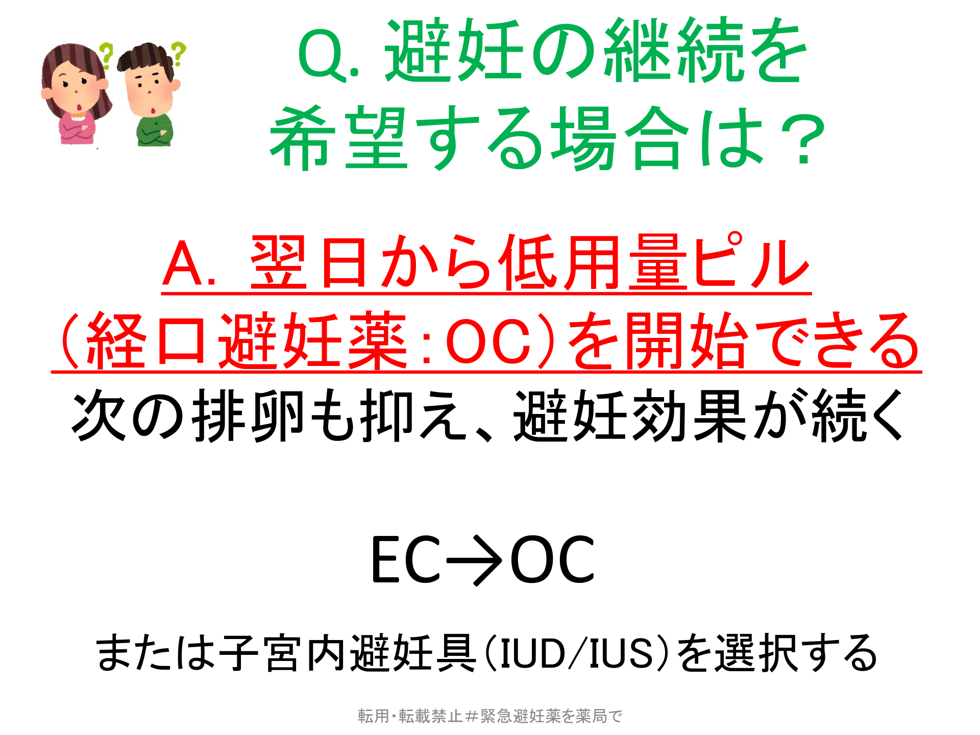 #14. Q. 避妊の継続を 希望する場合は? A.翌日から低用量ピル (経口避妊薬:OC)を開始できる 次の排卵も抑え、避妊効果が続く EC→OC または子宮内避妊具(IUD/IUS)を選択する 転用・転載禁止#緊急避妊薬を薬局で
