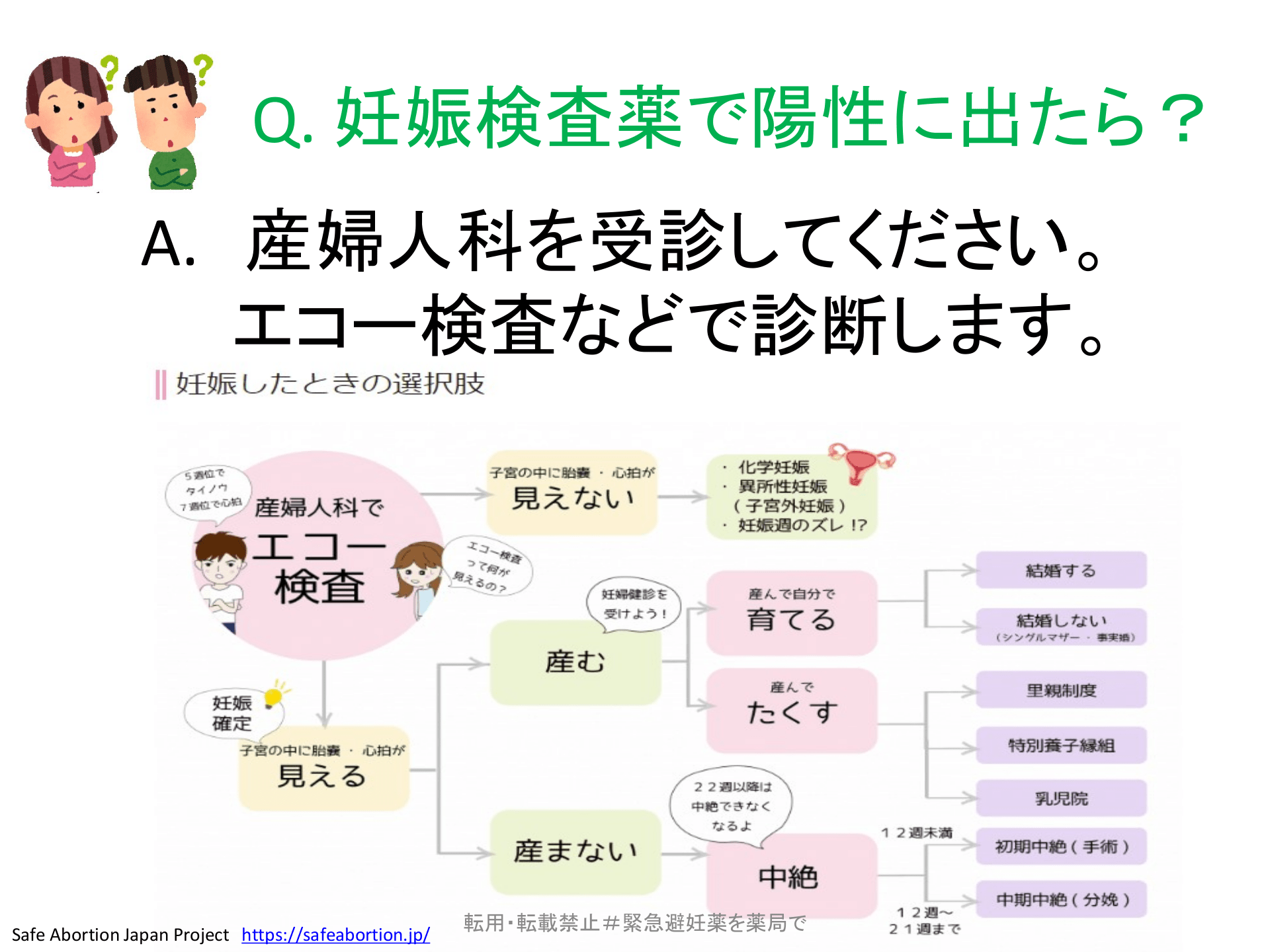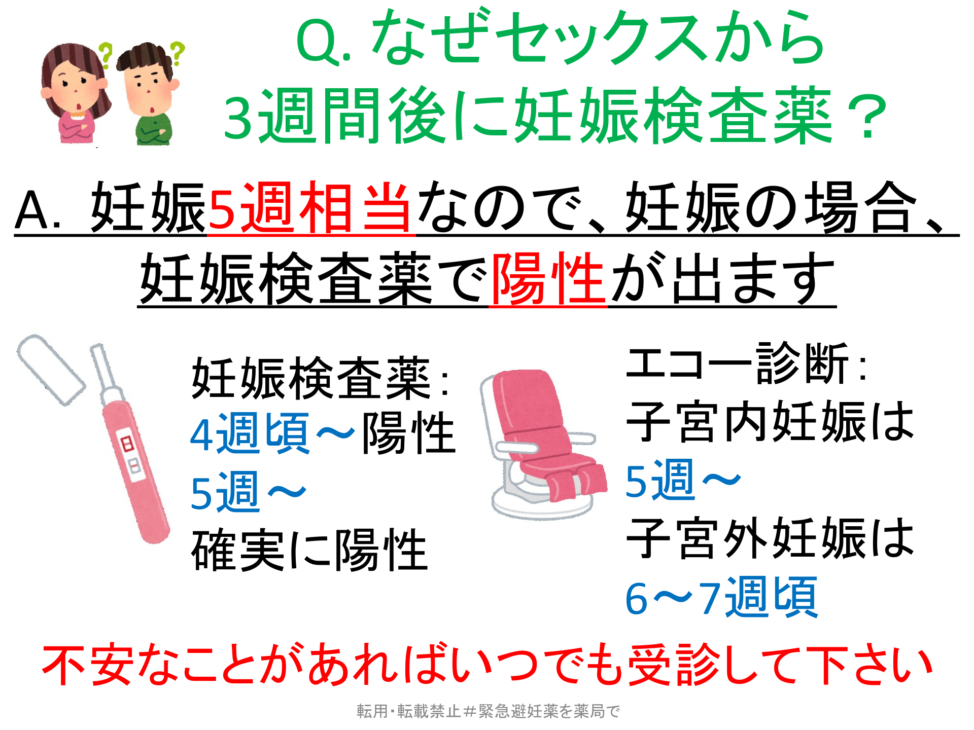 #17. Q. なぜセックスから 3週間後に妊娠検査薬? A.妊娠5週相当なので、妊娠の場合、 妊娠検査薬で陽性が出ます エコー診断: 子宮内妊娠は 5週~ 子宮外妊娠は 6~7週頃 不安なことがあればいつでも受診して下さい 妊娠検査薬: 4週頃~陽性 5週~ 確実に陽性 転用・転載禁止#緊急避妊薬を薬局で