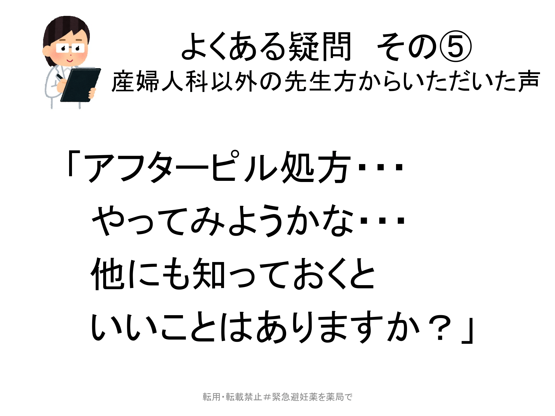 #20. よくある疑問 その⑤ 産婦人科以外の先生方からいただいた声 「アフターピル処方・・・ やってみようかな・・・ 他にも知っておくと いいことはありますか?」 転用・転載禁止#緊急避妊薬を薬局で