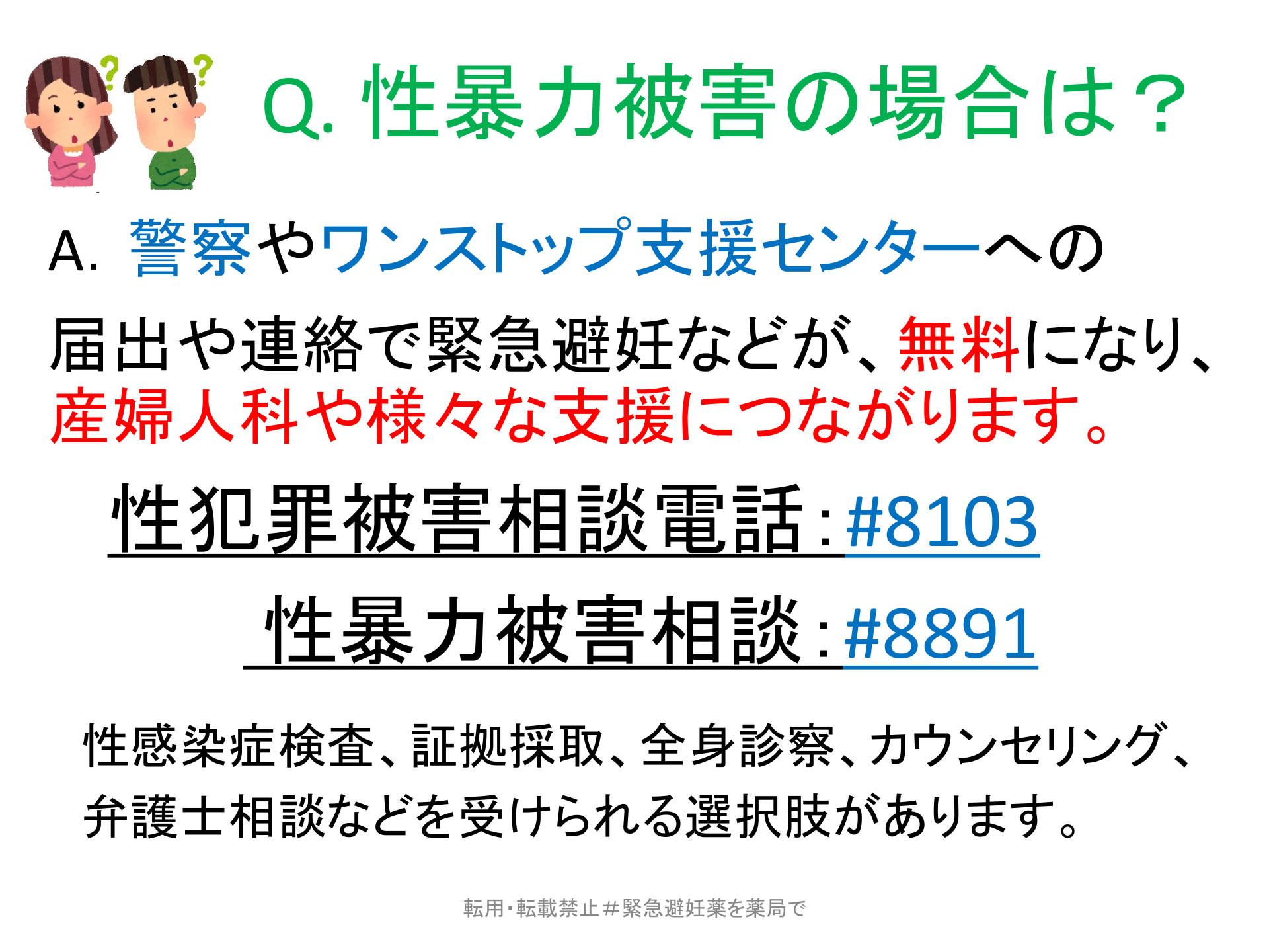 #22. Q. 性暴力被害の場合は? A.警察やワンストップ支援センターへの 届出や連絡で緊急避妊などが、無料になり、 産婦人科や様々な支援につながります。 性犯罪被害相談電話:#8103 性暴力被害相談:#8891 性感染症検査、証拠採取、全身診察、カウンセリング、 弁護士相談などを受けられる選択肢があります。 転用・転載禁止#緊急避妊薬を薬局で