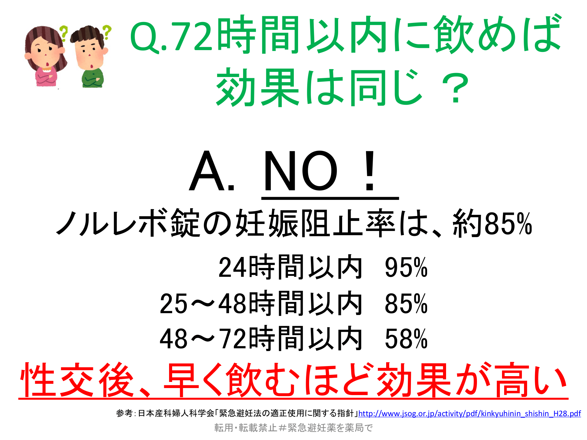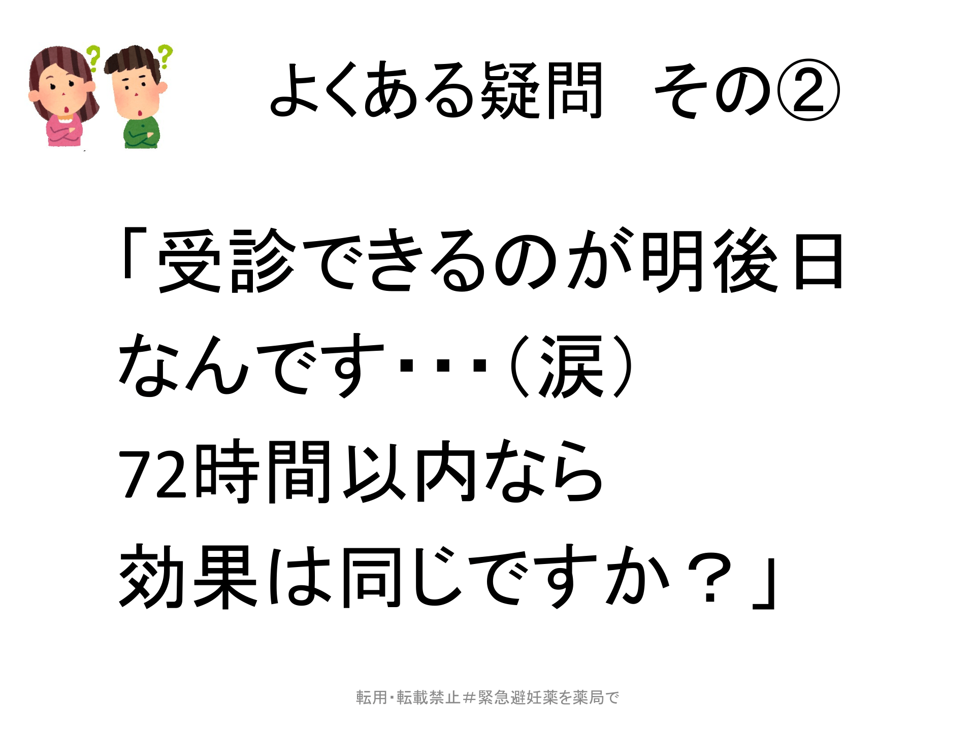 #5. よくある疑問 その② 「受診できるのが明後日 なんです・・・(涙) 72時間以内なら 効果は同じですか?」 転用・転載禁止#緊急避妊薬を薬局で