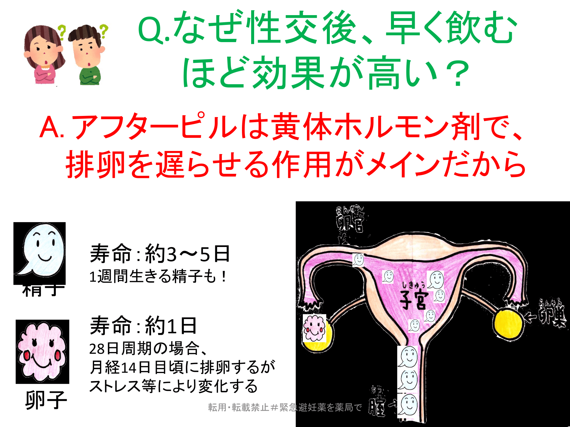 #7. Q.なぜ性交後、早く飲む ほど効果が高い? A. アフターピルは黄体ホルモン剤で、 排卵を遅らせる作用がメインだから 寿命:約3~5日 精子 1週間生きる精子も! 寿命:約1日 卵子 28日周期の場合、 月経14日目頃に排卵するが ストレス等により変化する 転用・転載禁止#緊急避妊薬を薬局で