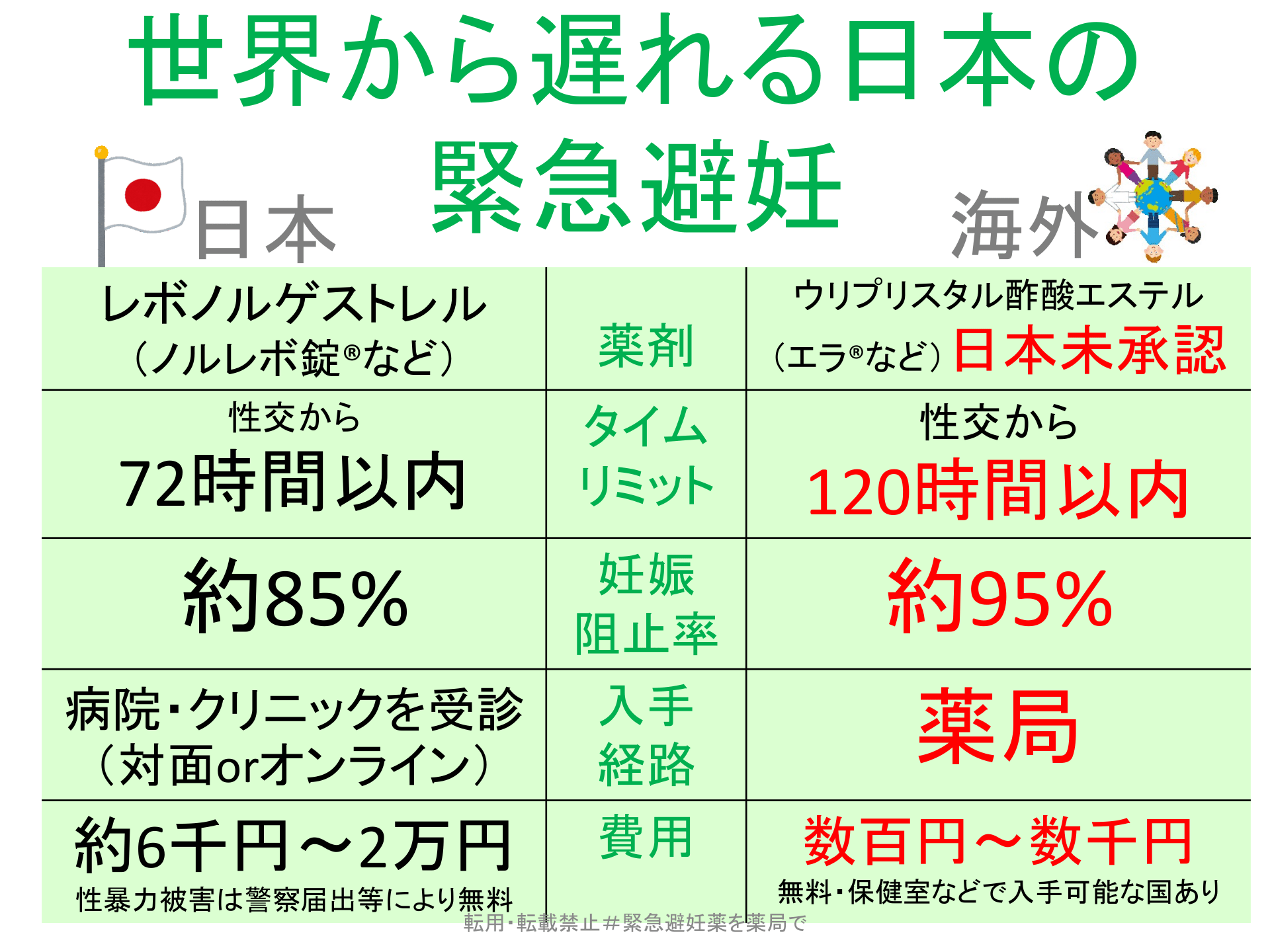 #8. 世界から遅れる日本の 緊急避妊 海外 日本 レボノルゲストレル ウリプリスタル酢酸エステル (ノルレボ錠®など) 薬剤 (エラ®など)日本未承認 性交から タイム リミット 性交から 72時間以内 妊娠 阻止率 病院・クリニックを受診 入手 (対面orオンライン) 経路 約6千円~2万円 費用 120時間以内 約85% 性暴力被害は警察届出等により無料 約95% 薬局 数百円~数千円 無料・保健室などで入手可能な国あり 転用・転載禁止#緊急避妊薬を薬局で