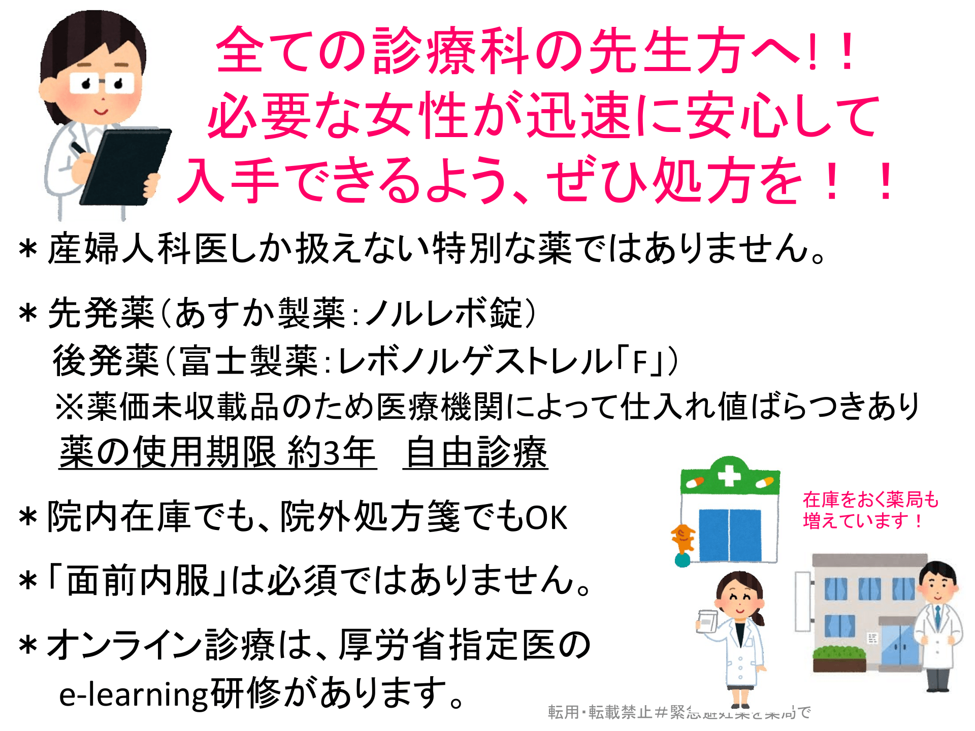#9. 全ての診療科の先生方へ!! 必要な女性が迅速に安心して 入手できるよう、ぜひ処方を!! *産婦人科医しか扱えない特別な薬ではありません。 *先発薬(あすか製薬:ノルレボ錠) 後発薬(富士製薬:レボノルゲストレル「F」) ※薬価未収載品のため医療機関によって仕入れ値ばらつきあり 薬の使用期限 約3年 自由診療 *院内在庫でも、院外処方箋でもOK 在庫をおく薬局も 増えています! *「面前内服」は必須ではありません。 *オンライン診療は、厚労省指定医の e-learning研修があります。 転用・転載禁止#緊急避妊薬を薬局で