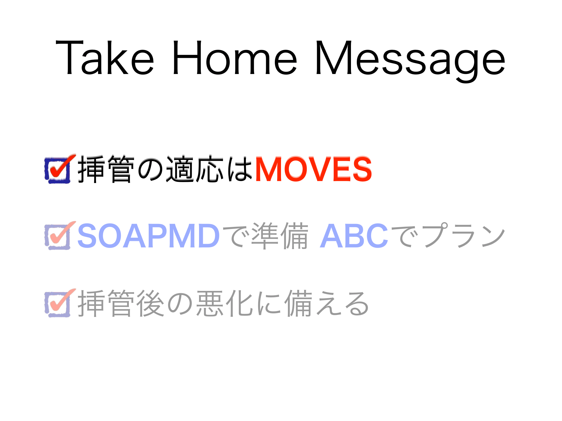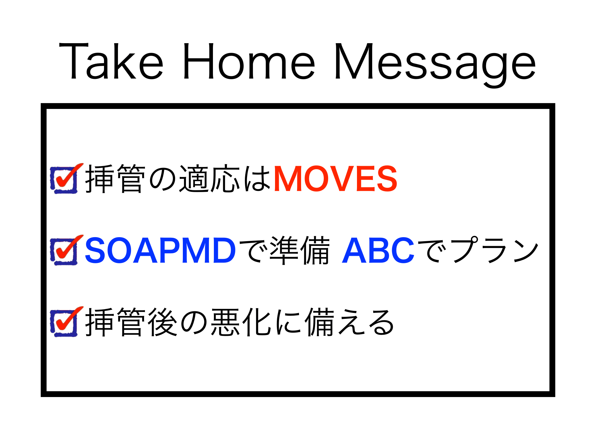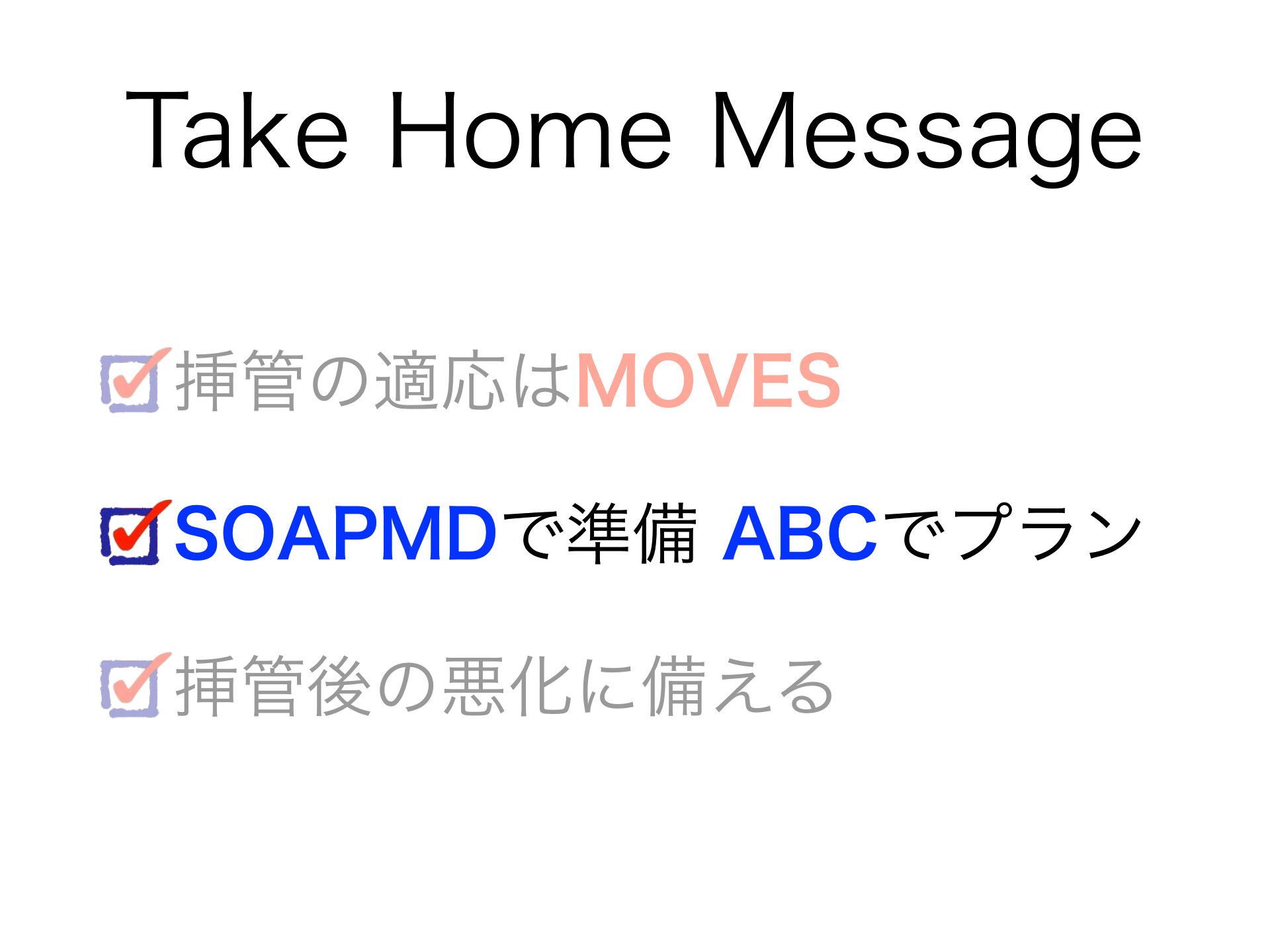 #61. Take Home Message 挿管の適応はMOVES SOAPMDで準備 ABCでプラン 挿管後の悪化に備える