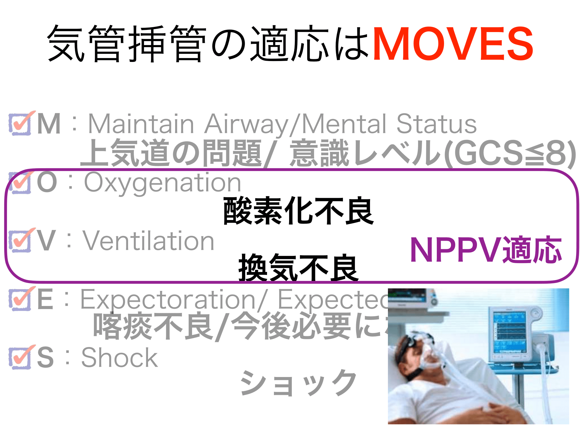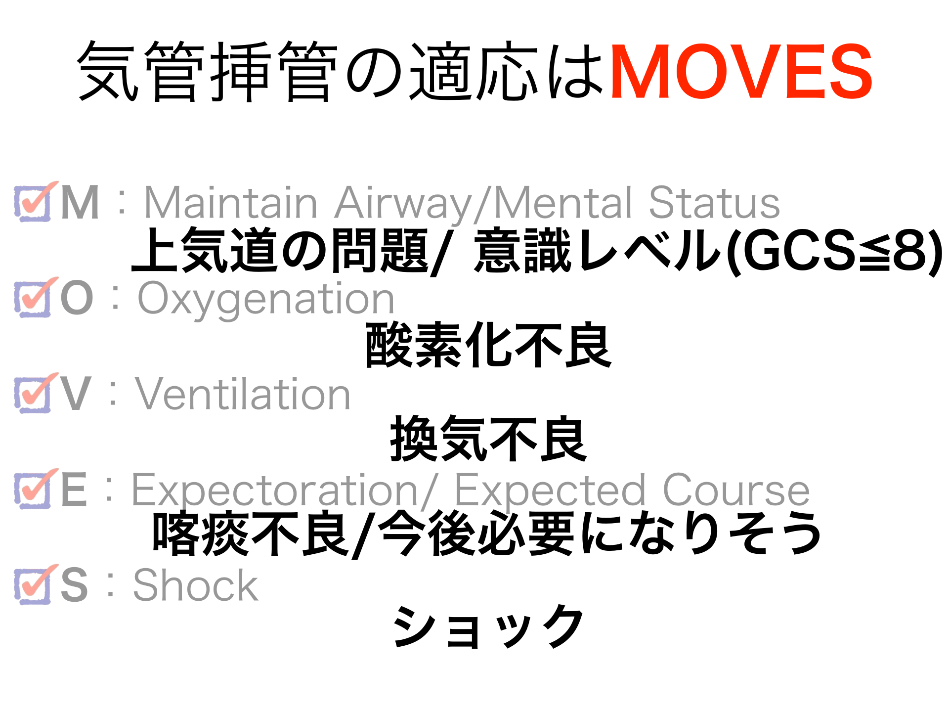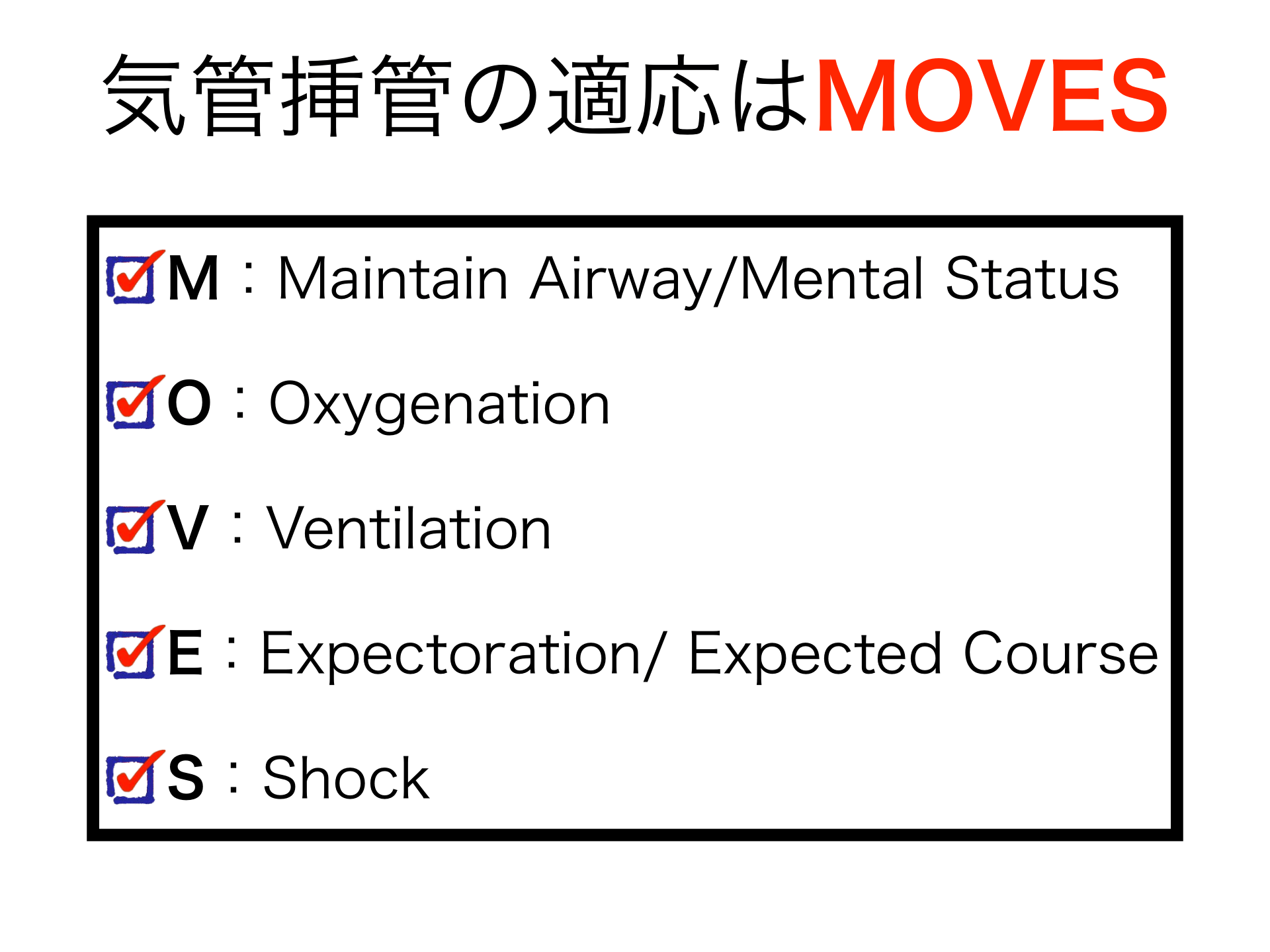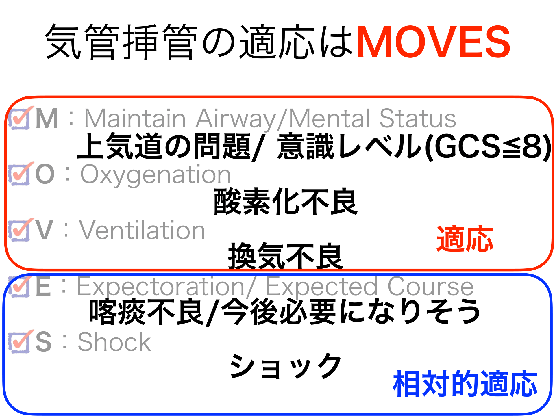 #14. 気管挿管の適応はMOVES M:Maintain Airway/Mental Status O:Oxygenation V:Ventilation E:Expectoration/ Expected Course S:Shock