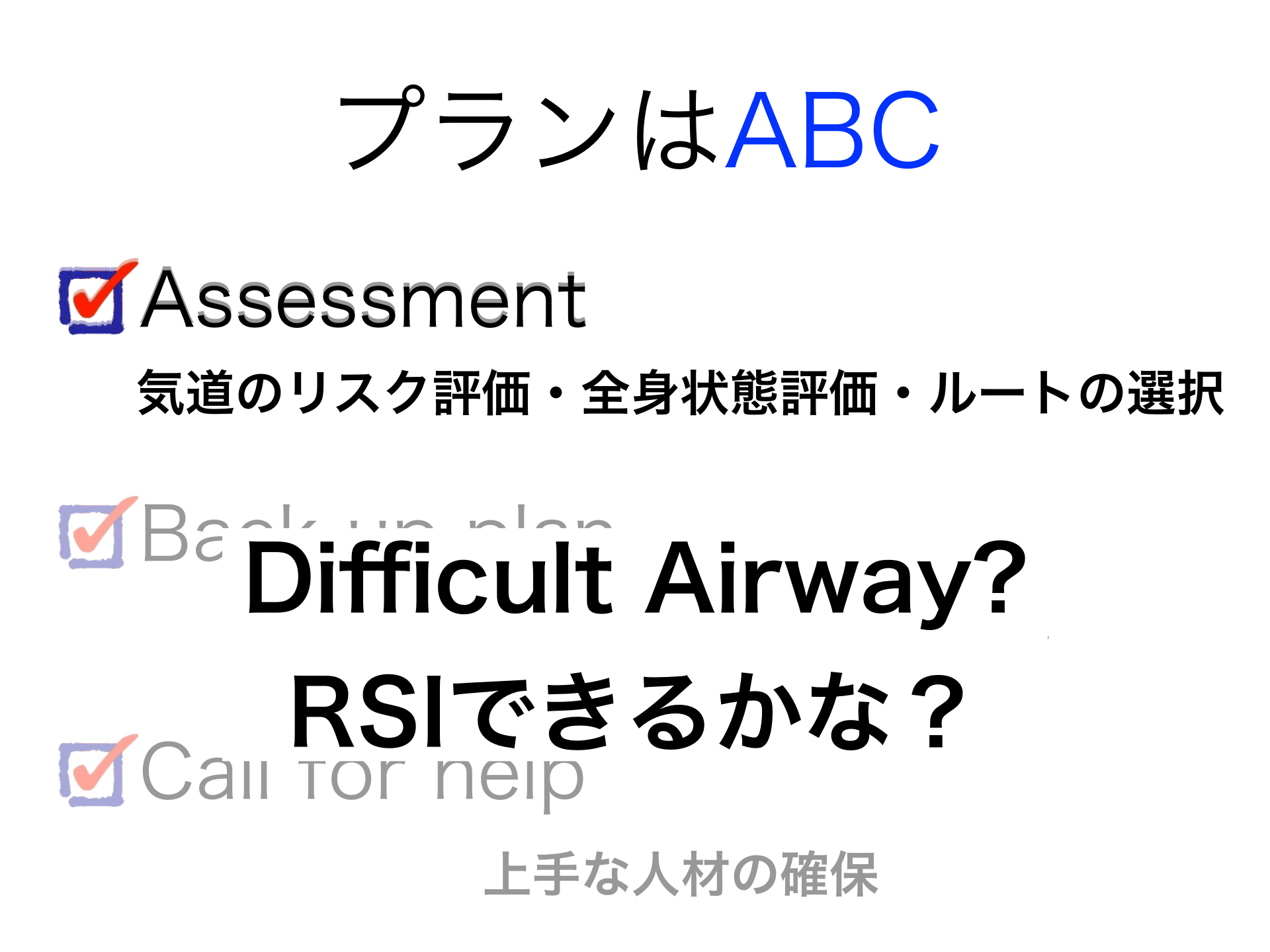 #22. プランはABC Assessment 気道のリスク評価・全身状態評価・ルートの選択 Back up plan Difficult Airway? 喉頭展開できなかった時のプラン RSIできるかな? Call for help 上手な人材の確保