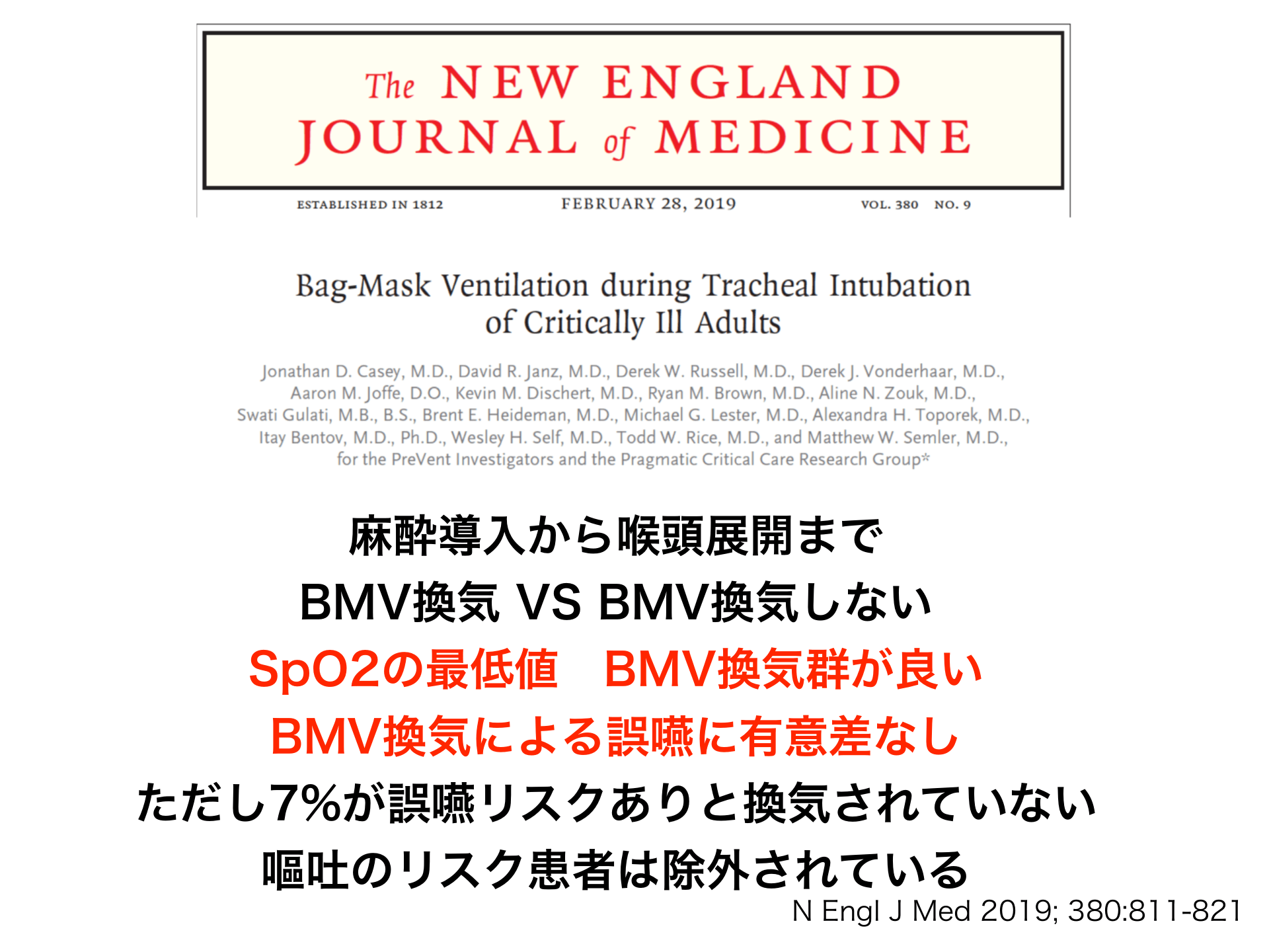 #26. 麻酔導入から喉頭展開まで BMV換気 VS BMV換気しない SpO2の最低値 BMV換気群が良い BMV換気による誤嚥に有意差なし ただし7%が誤嚥リスクありと換気されていない 嘔吐のリスク患者は除外されている N Engl J Med 2019; 380:811-821