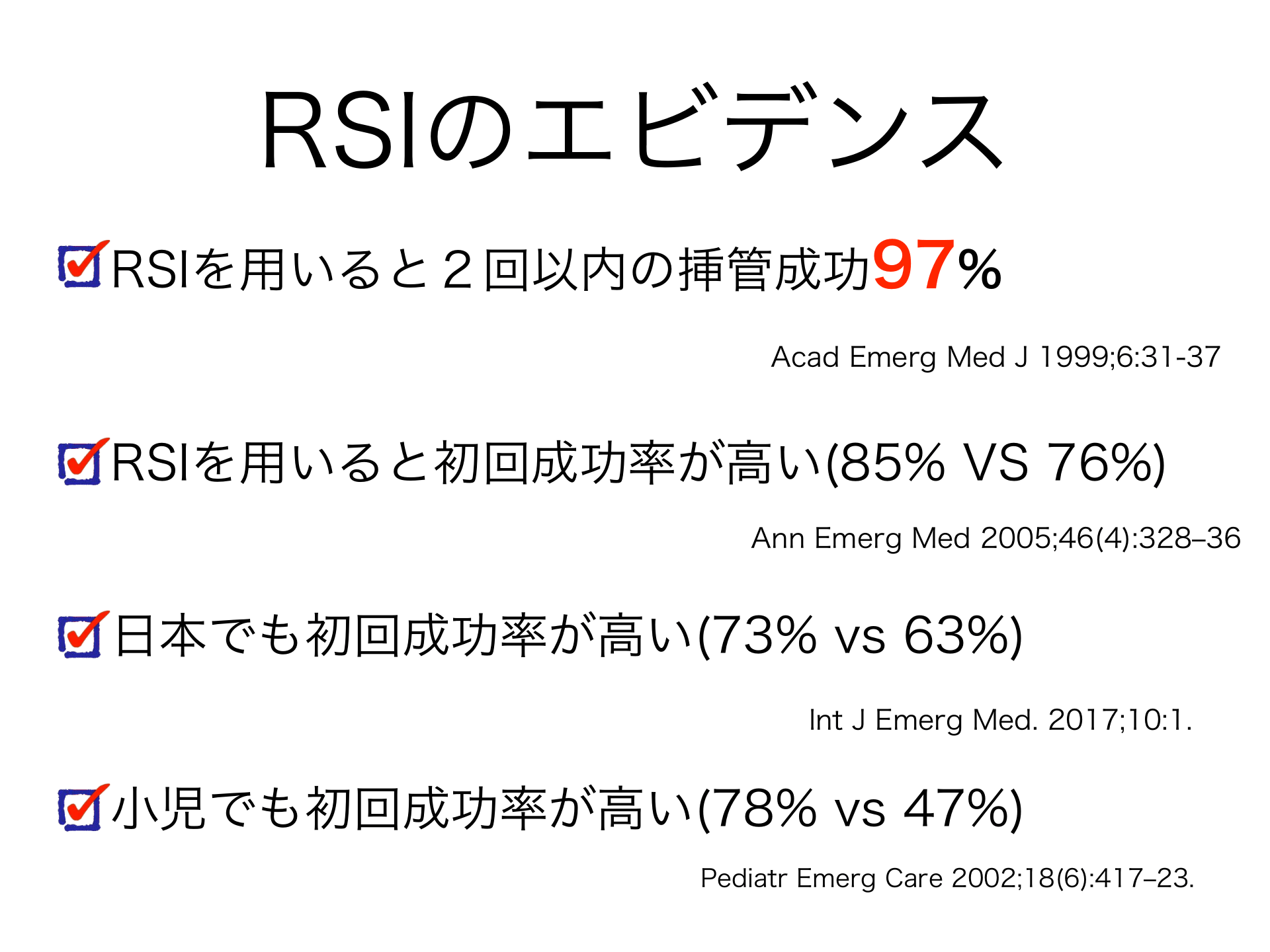 #27. RSIのエビデンス RSIを用いると2回以内の挿管成功97% Acad Emerg Med J 1999;6:31-37 RSIを用いると初回成功率が高い(85% VS 76%) Ann Emerg Med 2005;46(4):328‒36 日本でも初回成功率が高い(73% vs 63%) Int J Emerg Med. 2017;10:1. 小児でも初回成功率が高い(78% vs 47%) Pediatr Emerg Care 2002;18(6):417‒23.