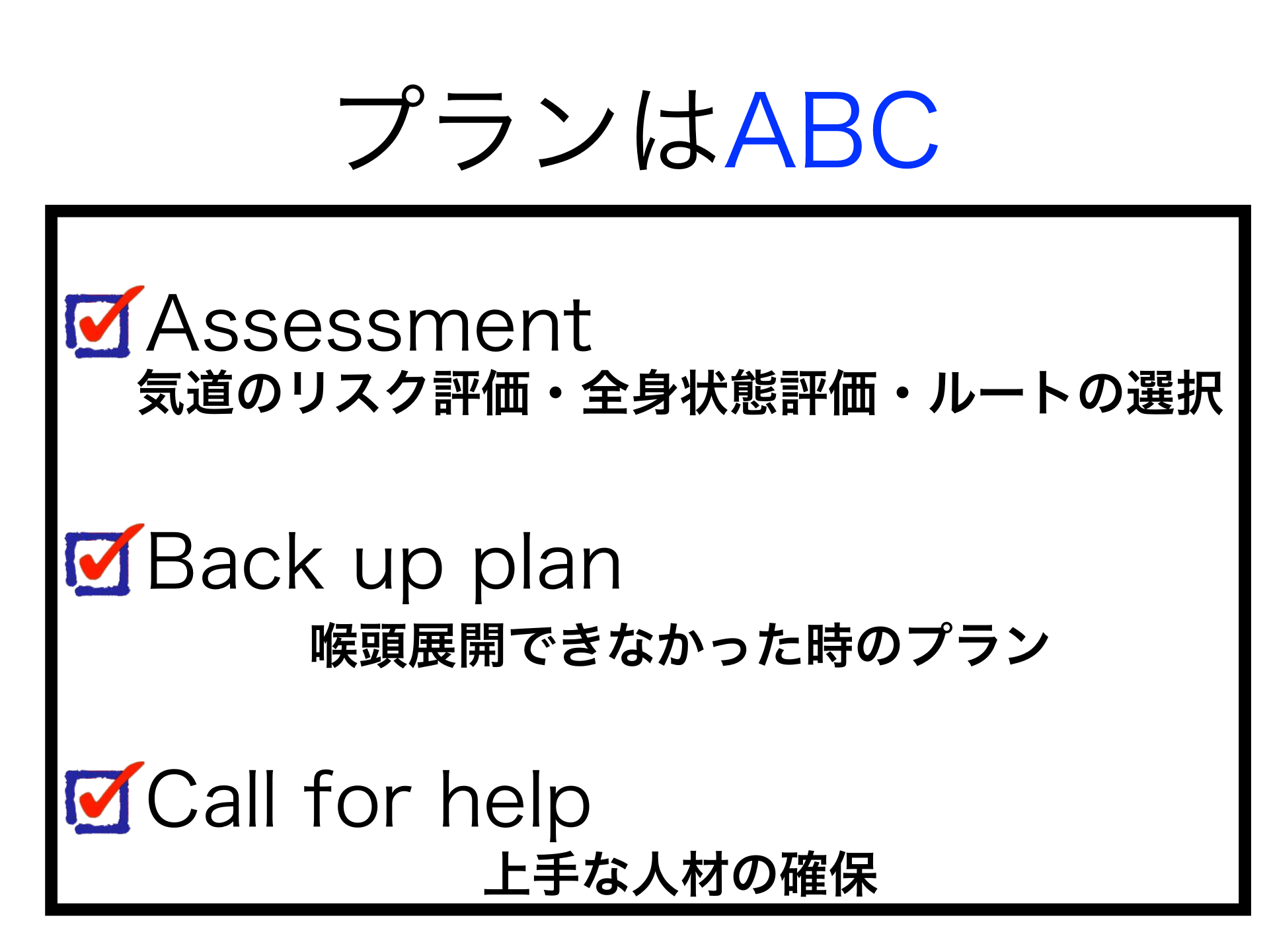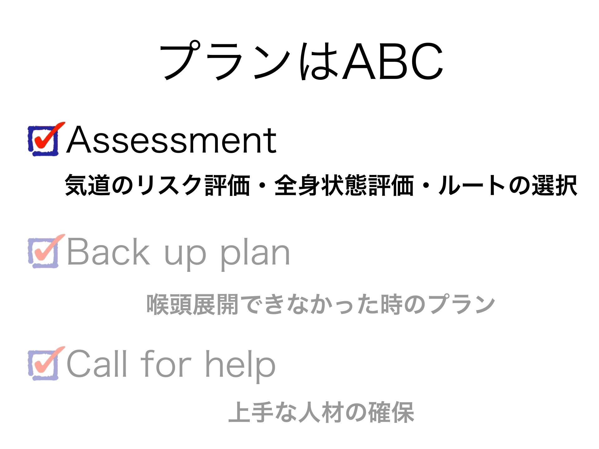 #66. プランはABC Assessment 気道のリスク評価・全身状態評価・ルートの選択 Back up plan 喉頭展開できなかった時のプラン Call for help 上手な人材の確保