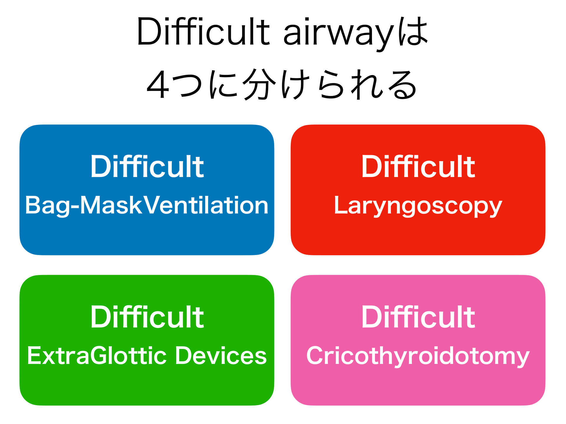 #30. Difficult airwayは 4つに分けられる Difficult Difficult Bag-MaskVentilation Laryngoscopy Difficult Difficult ExtraGlottic Devices Cricothyroidotomy