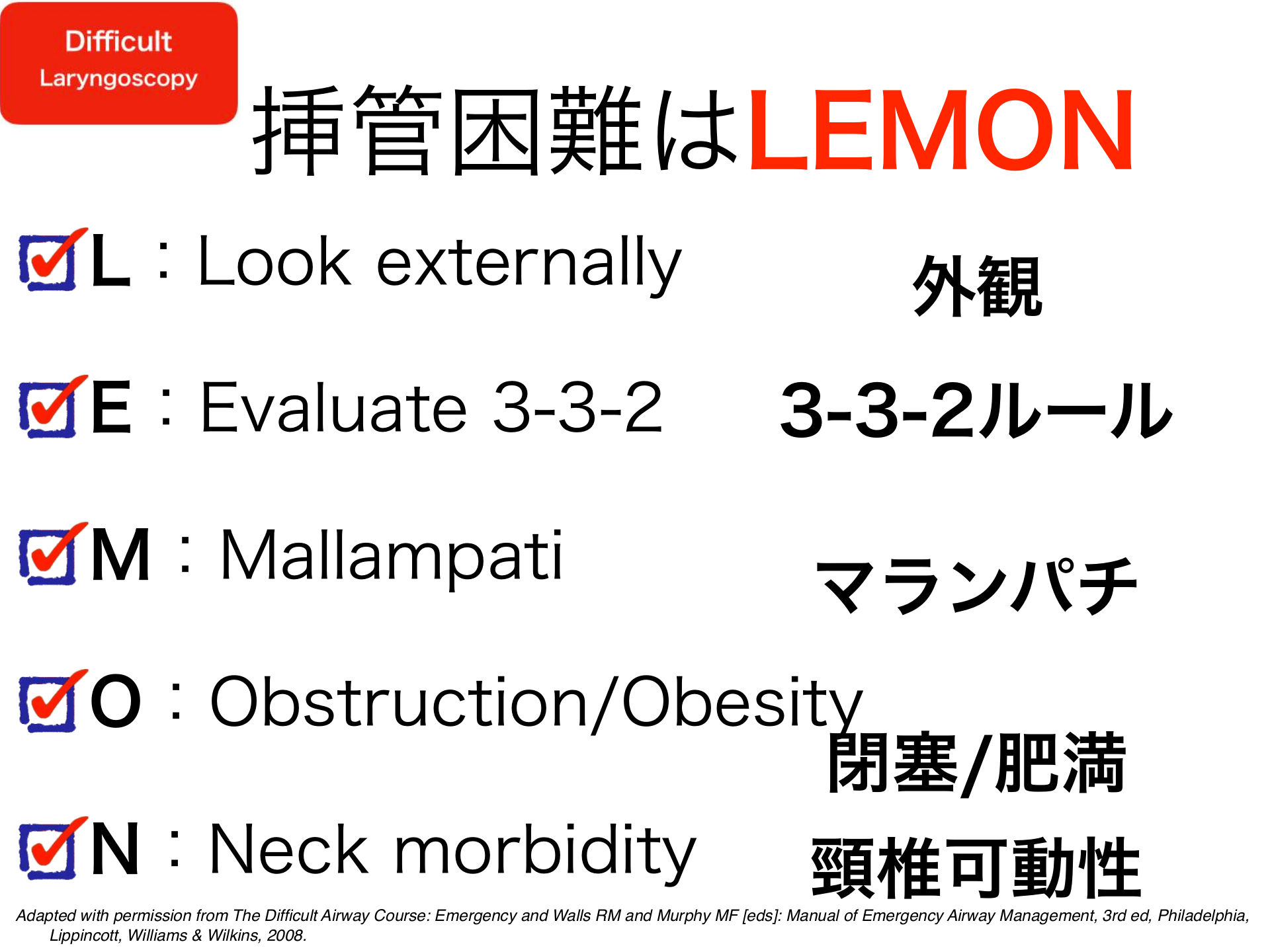 #32. 挿管困難はLEMON L:Look externally 外観 E:Evaluate 3-3-2 3-3-2ルール M:Mallampati マランパチ O:Obstruction/Obesity 閉塞/肥満 N:Neck morbidity 頸椎可動性 Adapted with permission from The Difficult Airway Course: Emergency and Walls RM and Murphy MF [eds]: Manual of Emergency Airway Management, 3rd ed, Philadelphia, Lippincott, Williams & Wilkins, 2008.