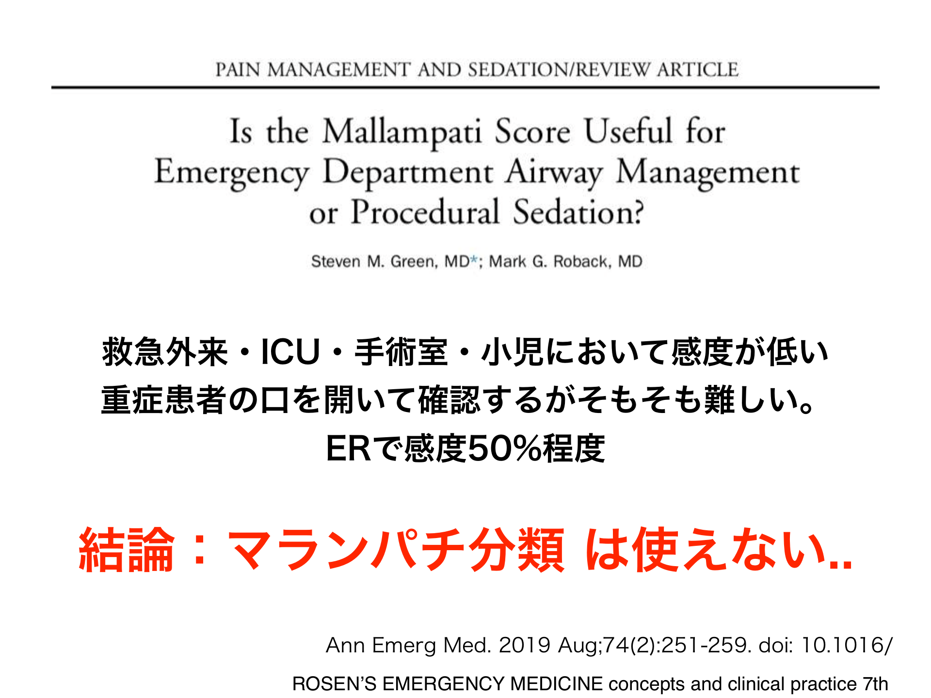 #33. 救急外来・ICU・手術室・小児において感度が低い 重症患者の口を開いて確認するがそもそも難しい。 ERで感度50%程度 結論:マランパチ分類 は使えない.. Ann Emerg Med. 2019 Aug;74(2):251-259. doi: 10.1016/ ROSEN’S EMERGENCY MEDICINE concepts and clinical practice 7th
