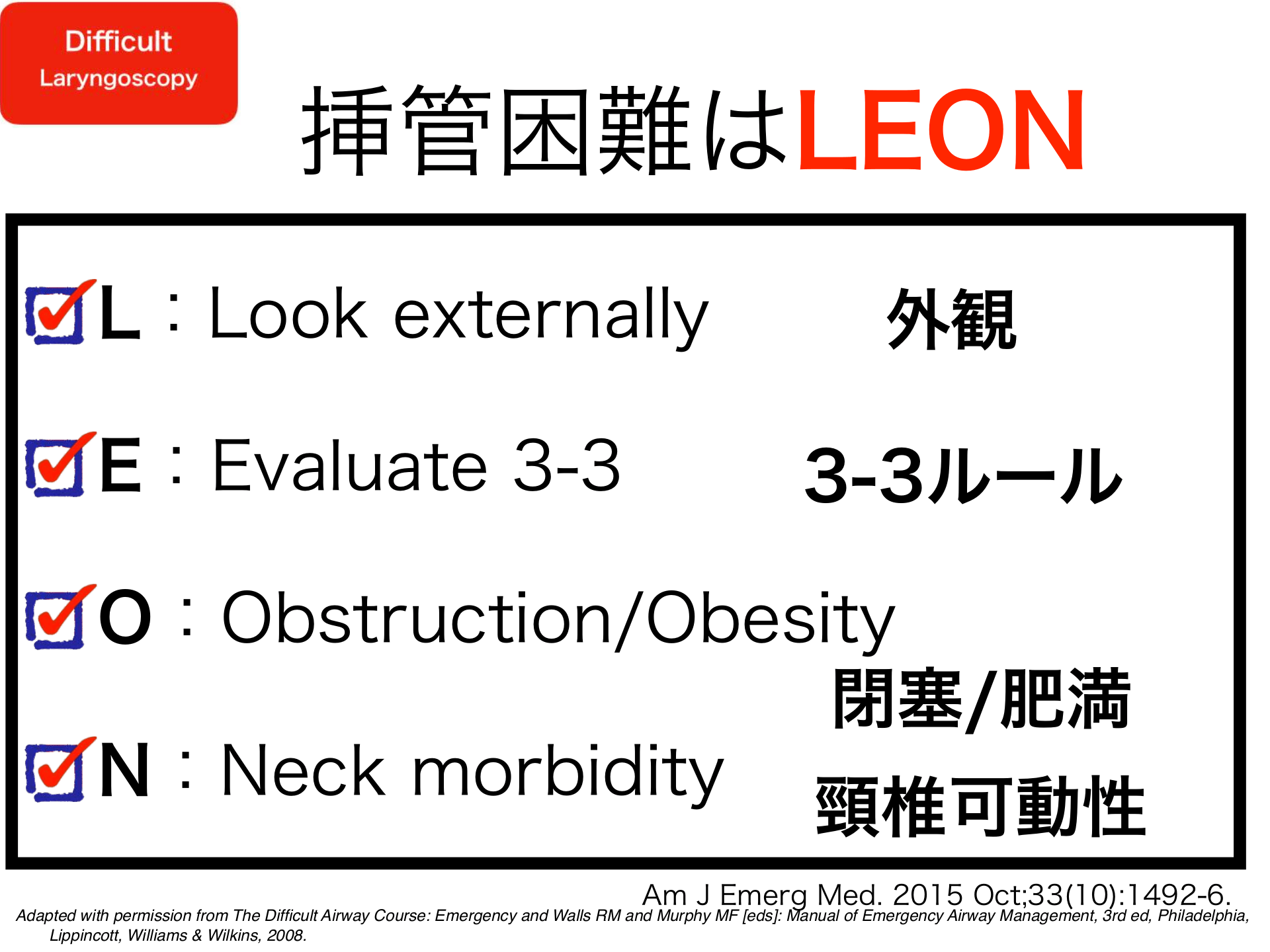 #68. 挿管困難はLEON L:Look externally E:Evaluate 3-3 外観 3-3ルール O:Obstruction/Obesity 閉塞/肥満 N:Neck morbidity 頸椎可動性 Am J Emerg Med. 2015 Oct;33(10):1492-6. Adapted with permission from The Difficult Airway Course: Emergency and Walls RM and Murphy MF [eds]: Manual of Emergency Airway Management, 3rd ed, Philadelphia, Lippincott, Williams & Wilkins, 2008.