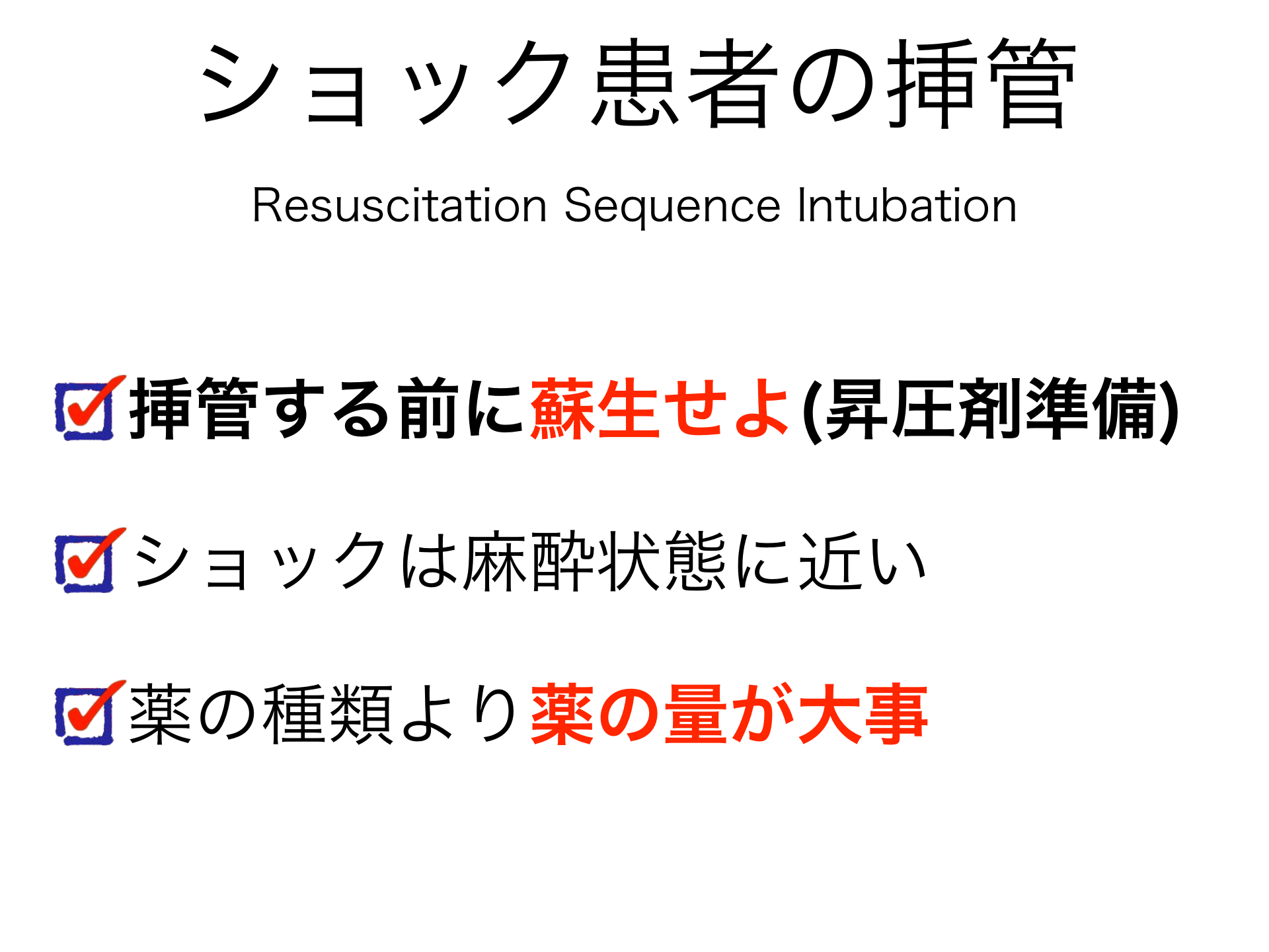 #35. ショック患者の挿管 Resuscitation Sequence Intubation 挿管する前に蘇生せよ(昇圧剤準備) ショックは麻酔状態に近い 薬の種類より薬の量が大事