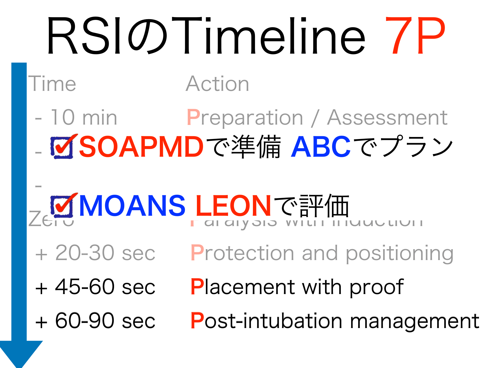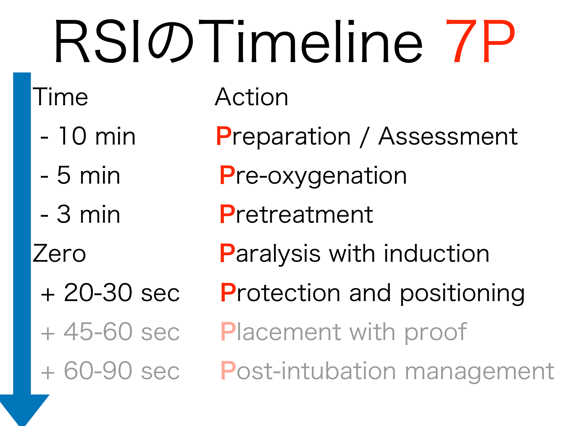 #64. RSIのTimeline 7P Time Action - 10 min Preparation / Assessment - 3 min Pretreatment + 20-30 sec Protection and positioning SOAPMDで準備 ABCでプラン - 5 min Pre-oxygenation MOANS LEONで評価 Zero Paralysis with induction + 45-60 sec + 60-90 sec Placement with proof Post-intubation management