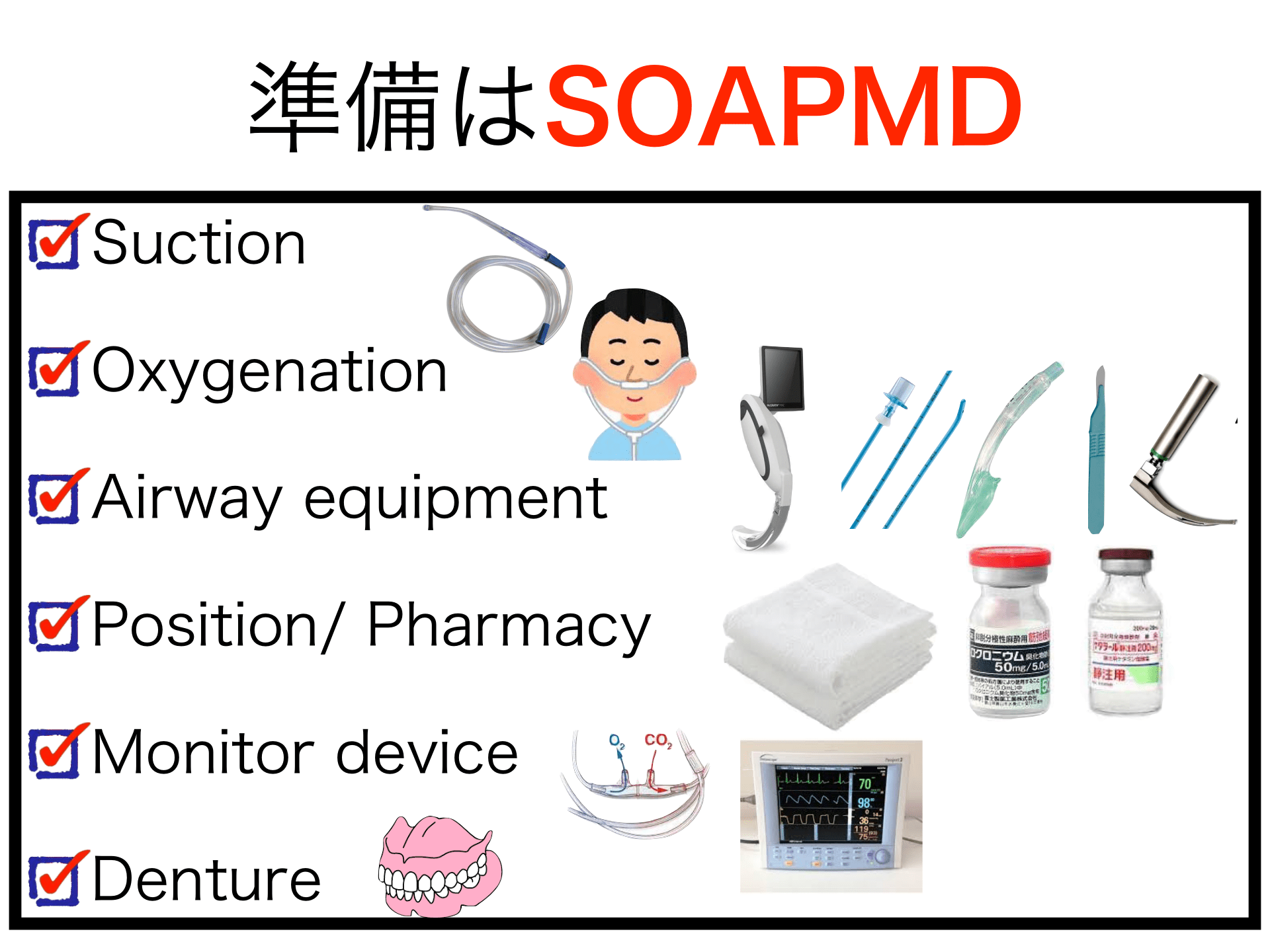 #54. 準備はSOAPMD Suction Oxygenation Airway equipment Position/ Pharmacy Monitor device Denture
