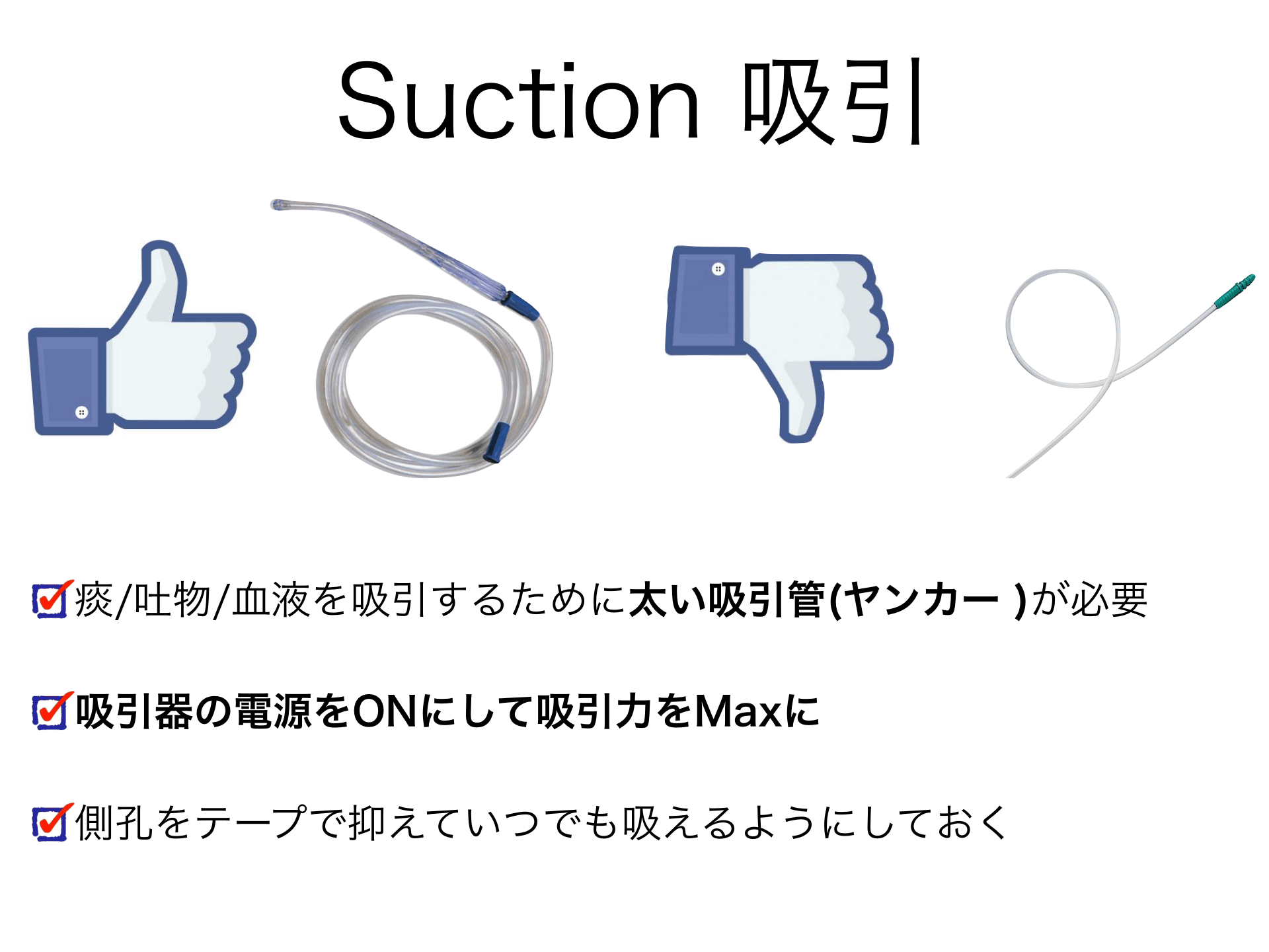 #40. Suction 吸引 痰/吐物/血液を吸引するために太い吸引管(ヤンカー )が必要 吸引器の電源をONにして吸引力をMaxに 側孔をテープで抑えていつでも吸えるようにしておく