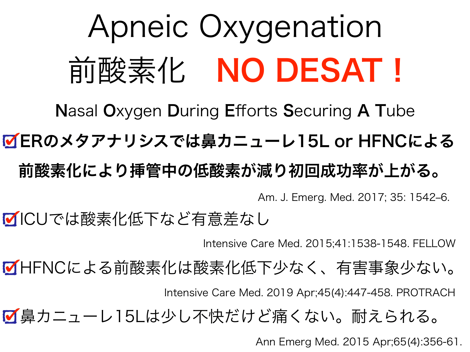 #42. Apneic Oxygenation 前酸素化 NO DESAT ! Nasal Oxygen During Efforts Securing A Tube ERのメタアナリシスでは鼻カニューレ15L or HFNCによる 前酸素化により挿管中の低酸素が減り初回成功率が上がる。 Am. J. Emerg. Med. 2017; 35: 1542‒6. ICUでは酸素化低下など有意差なし Intensive Care Med. 2015;41:1538-1548. FELLOW HFNCによる前酸素化は酸素化低下少なく、有害事象少ない。 Intensive Care Med. 2019 Apr;45(4):447-458. PROTRACH 鼻カニューレ15Lは少し不快だけど痛くない。耐えられる。 Ann Emerg Med. 2015 Apr;65(4):356-61.