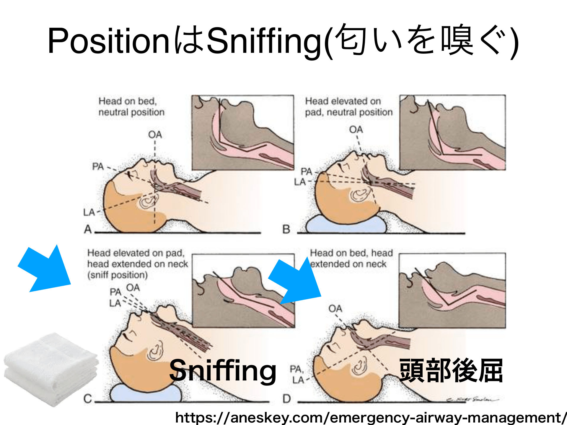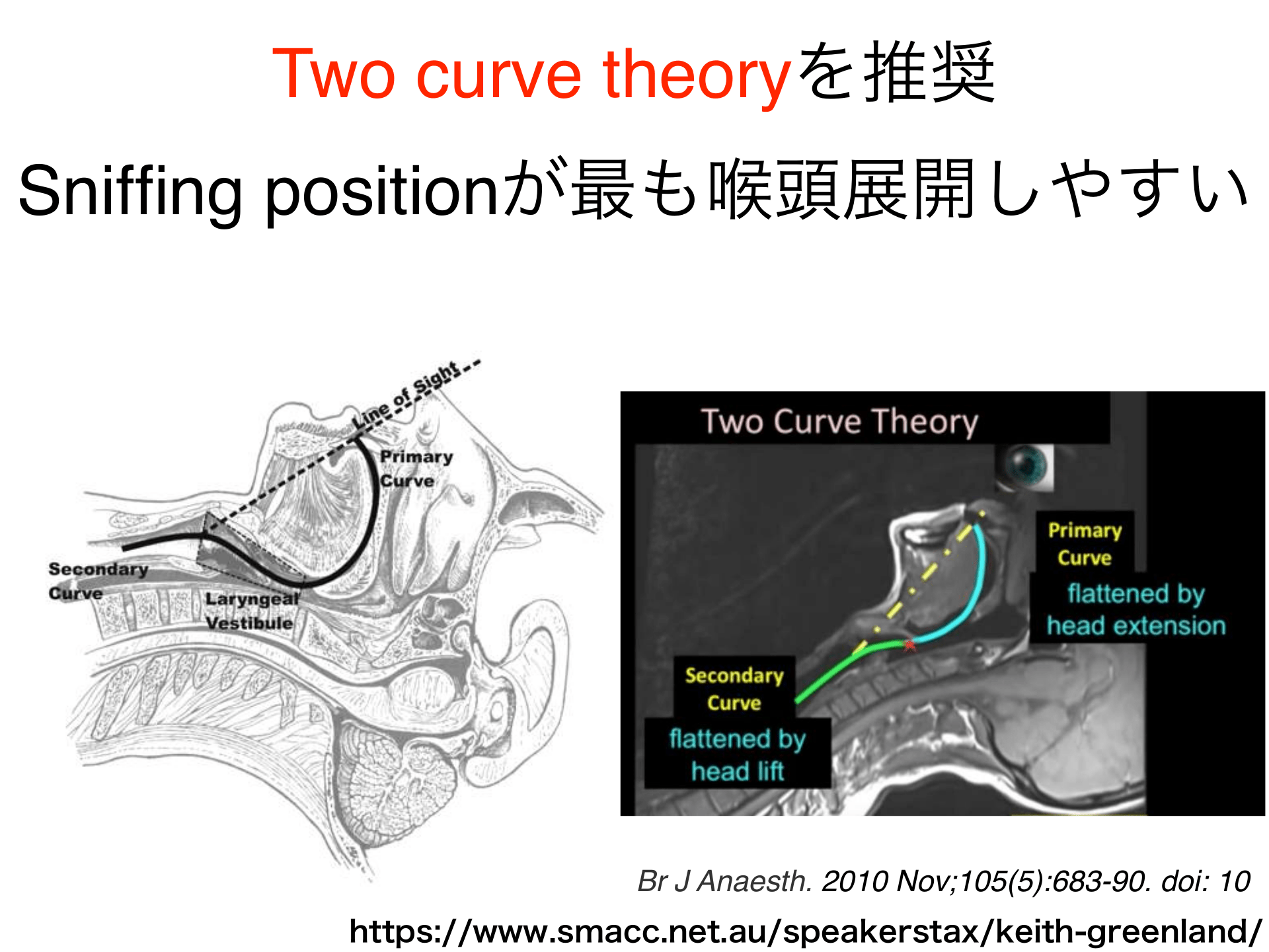 #73. ちなみに MRIでThree axis theoryは否定的 正常 頭部後屈 Sniffing Greenland KB. A proposed model for direct laryngoscopy and tracheal intubation. Anaesthesia. 63(2):156-61. 2008.