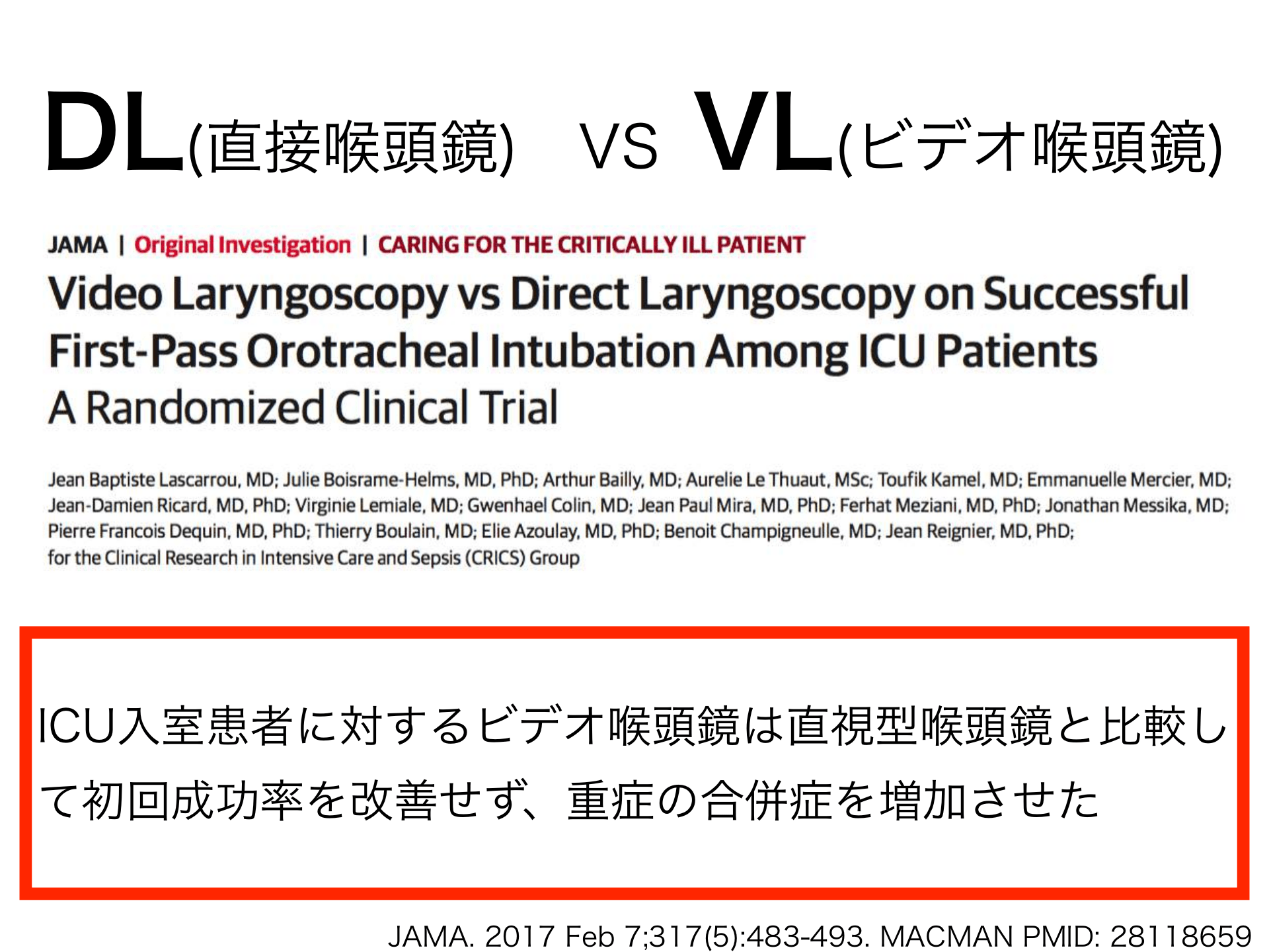 #49. DL(直接喉頭鏡) VS VL(ビデオ喉頭鏡) ICU入室患者に対するビデオ喉頭鏡は直視型喉頭鏡と比較し て初回成功率を改善せず、重症の合併症を増加させた JAMA. 2017 Feb 7;317(5):483-493. MACMAN PMID: 28118659