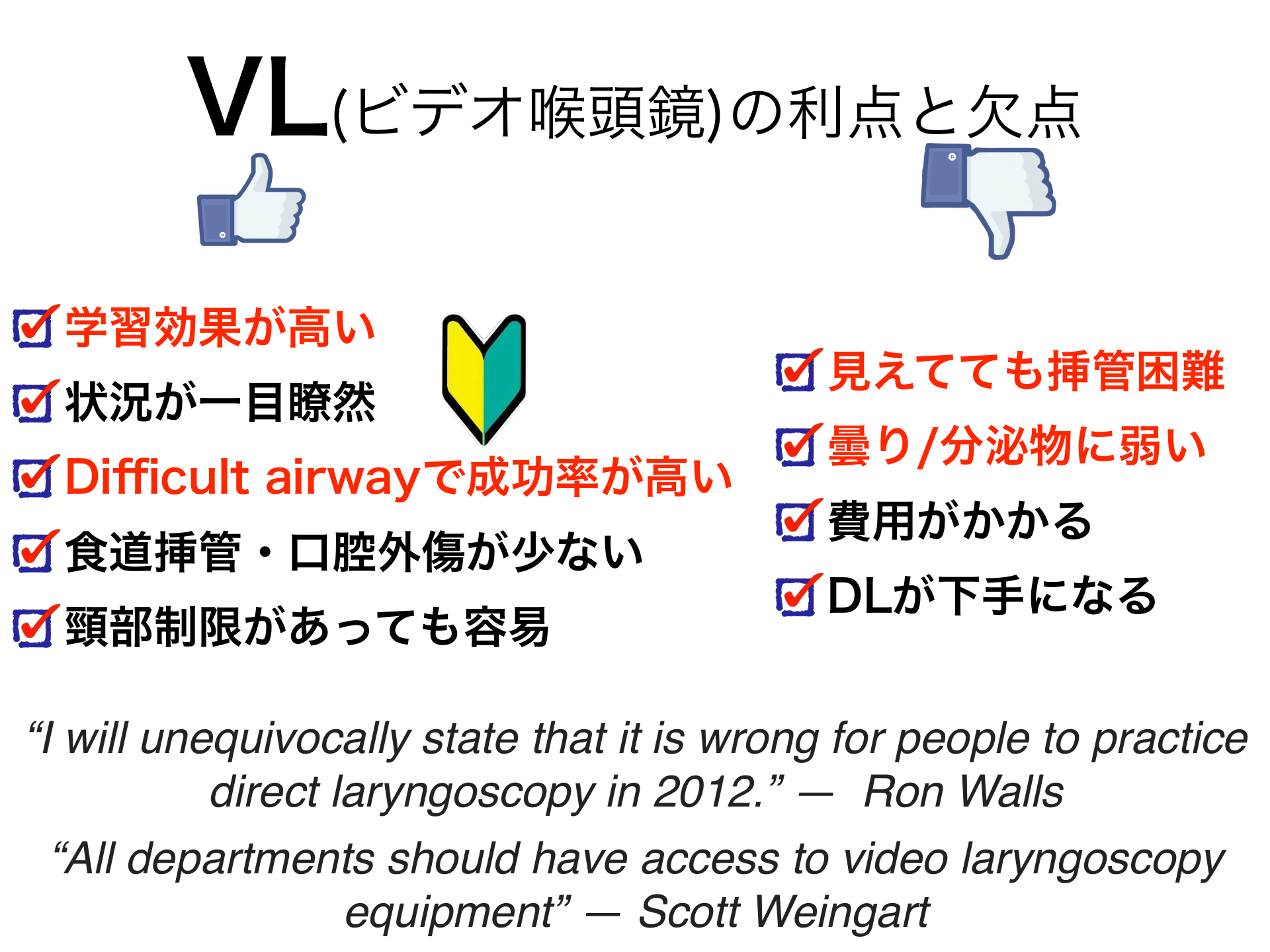 #51. VL(ビデオ喉頭鏡)の利点と欠点 学習効果が高い 状況が一目瞭然 Difficult airwayで成功率が高い 食道挿管・口腔外傷が少ない 頸部制限があっても容易 見えてても挿管困難 曇り/分泌物に弱い 費用がかかる DLが下手になる “I will unequivocally state that it is wrong for people to practice direct laryngoscopy in 2012.” — Ron Walls “All departments should have access to video laryngoscopy equipment” — Scott Weingart