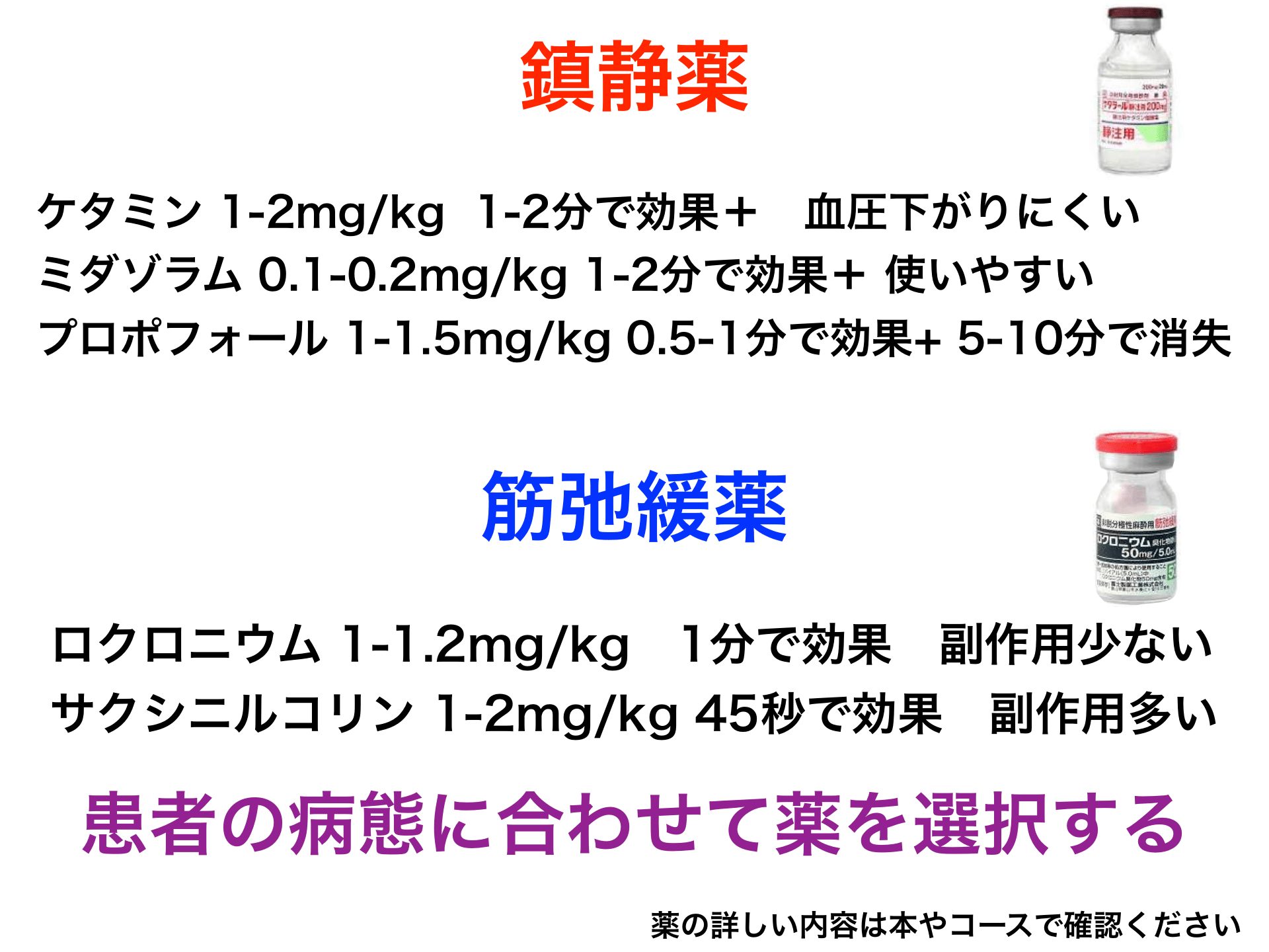 #53. 鎮静薬 ケタミン 1-2mg/kg 1-2分で効果+ 血圧下がりにくい ミダゾラム 0.1-0.2mg/kg 1-2分で効果+ 使いやすい プロポフォール 1-1.5mg/kg 0.5-1分で効果+ 5-10分で消失 筋弛緩薬 ロクロニウム 1-1.2mg/kg 1分で効果 副作用少ない サクシニルコリン 1-2mg/kg 45秒で効果 副作用多い 患者の病態に合わせて薬を選択する 薬の詳しい内容は本やコースで確認ください