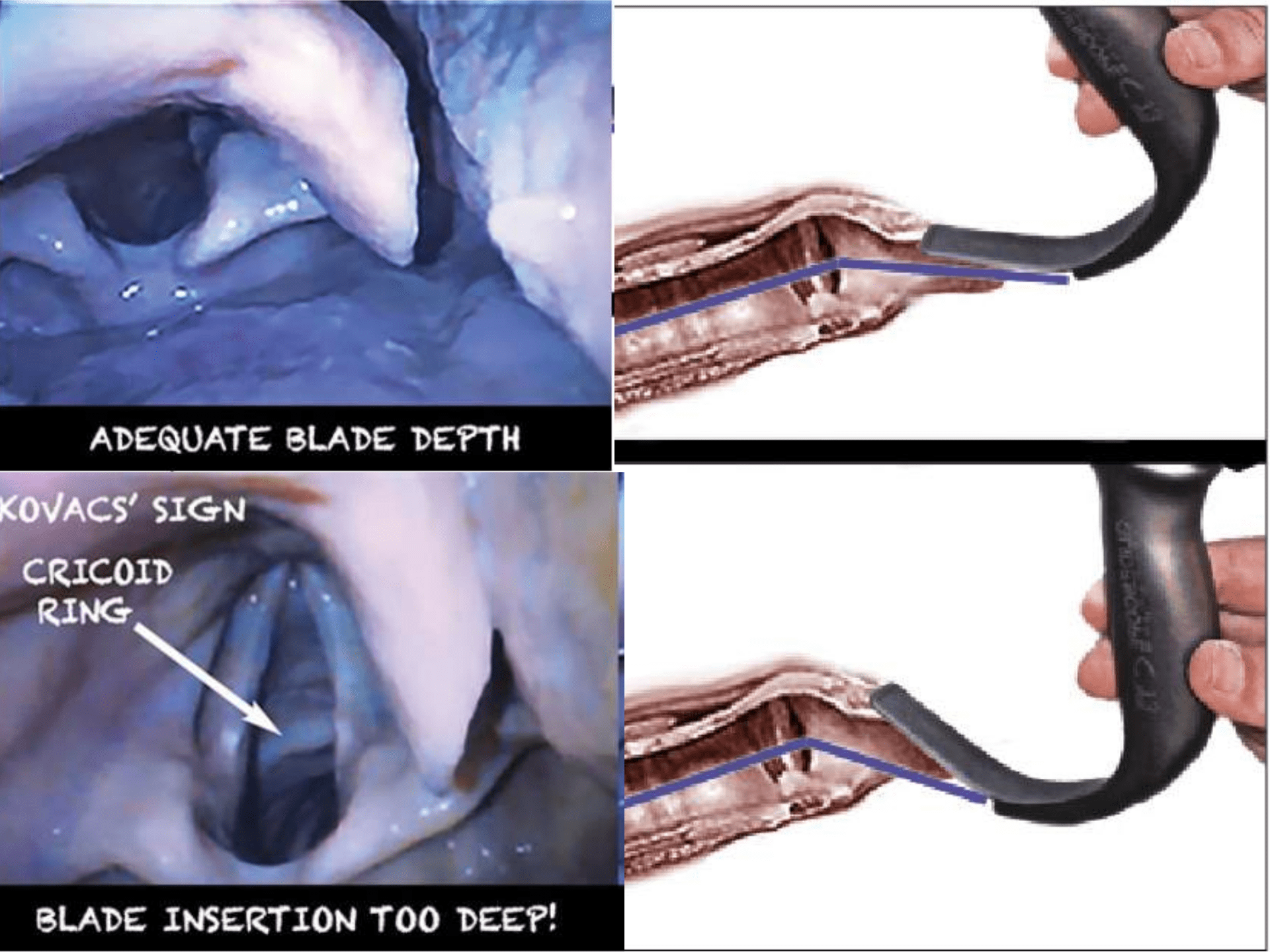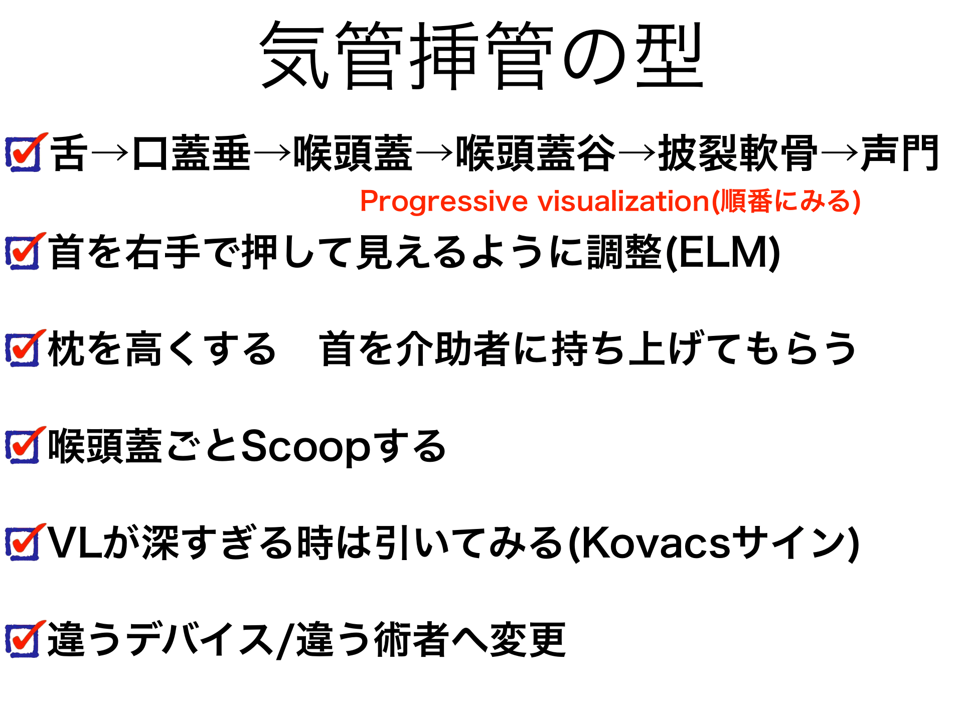 #55. 気管挿管の型 舌→口蓋垂→喉頭蓋→喉頭蓋谷→披裂軟骨→声門 Progressive visualization(順番にみる) 首を右手で押して見えるように調整(ELM) 枕を高くする 首を介助者に持ち上げてもらう 喉頭蓋ごとScoopする VLが深すぎる時は引いてみる(Kovacsサイン) 違うデバイス/違う術者へ変更