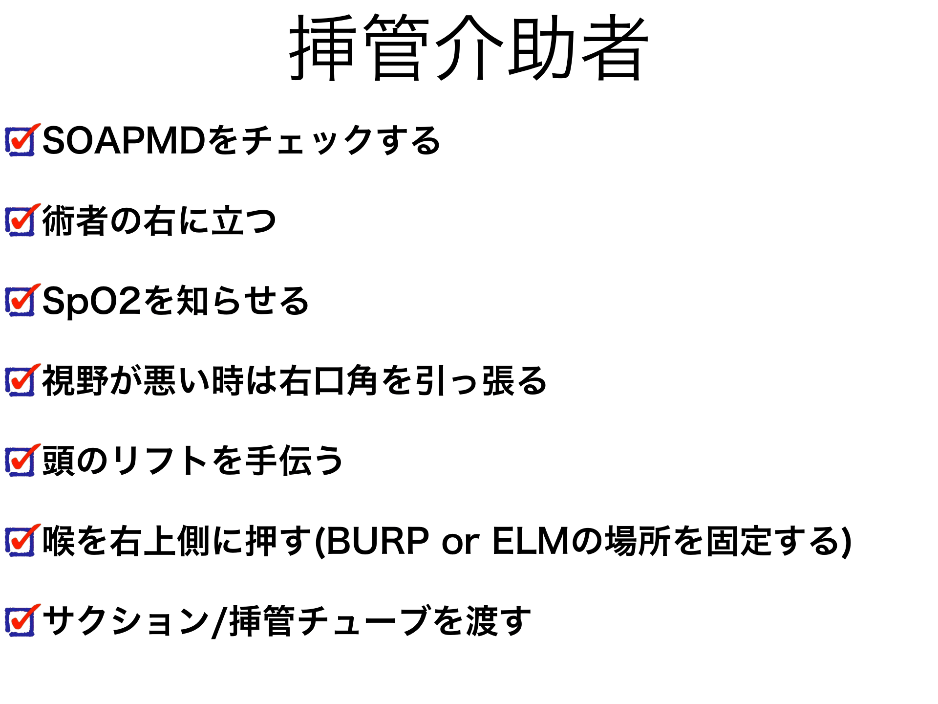 #58. 挿管介助者 SOAPMDをチェックする 術者の右に立つ SpO2を知らせる 視野が悪い時は右口角を引っ張る 頭のリフトを手伝う 喉を右上側に押す(BURP or ELMの場所を固定する) サクション/挿管チューブを渡す