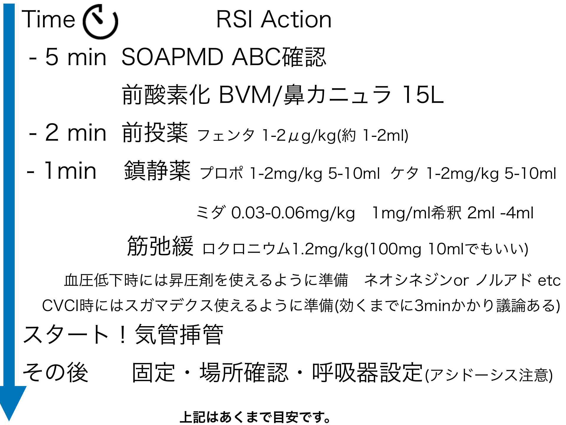 #59. Time RSI Action - 5 min SOAPMD ABC確認 前酸素化 BVM/鼻カニュラ 15L - 2 min 前投薬 フェンタ 1-2μg/kg(約 1-2ml) - 1min プロポ 1-2mg/kg 5-10ml ケタ 1-2mg/kg 5-10ml 鎮静薬 ミダ 0.03-0.06mg/kg 1mg/ml希釈 2ml -4ml 筋弛緩 ロクロニウム1.2mg/kg(100mg 10mlでもいい) 血圧低下時には昇圧剤を使えるように準備 ネオシネジンor ノルアド etc CVCI時にはスガマデクス使えるように準備(効くまでに3minかかり議論ある) スタート!気管挿管 その後 固定・場所確認・呼吸器設定(アシドーシス注意) 上記はあくまで目安です。