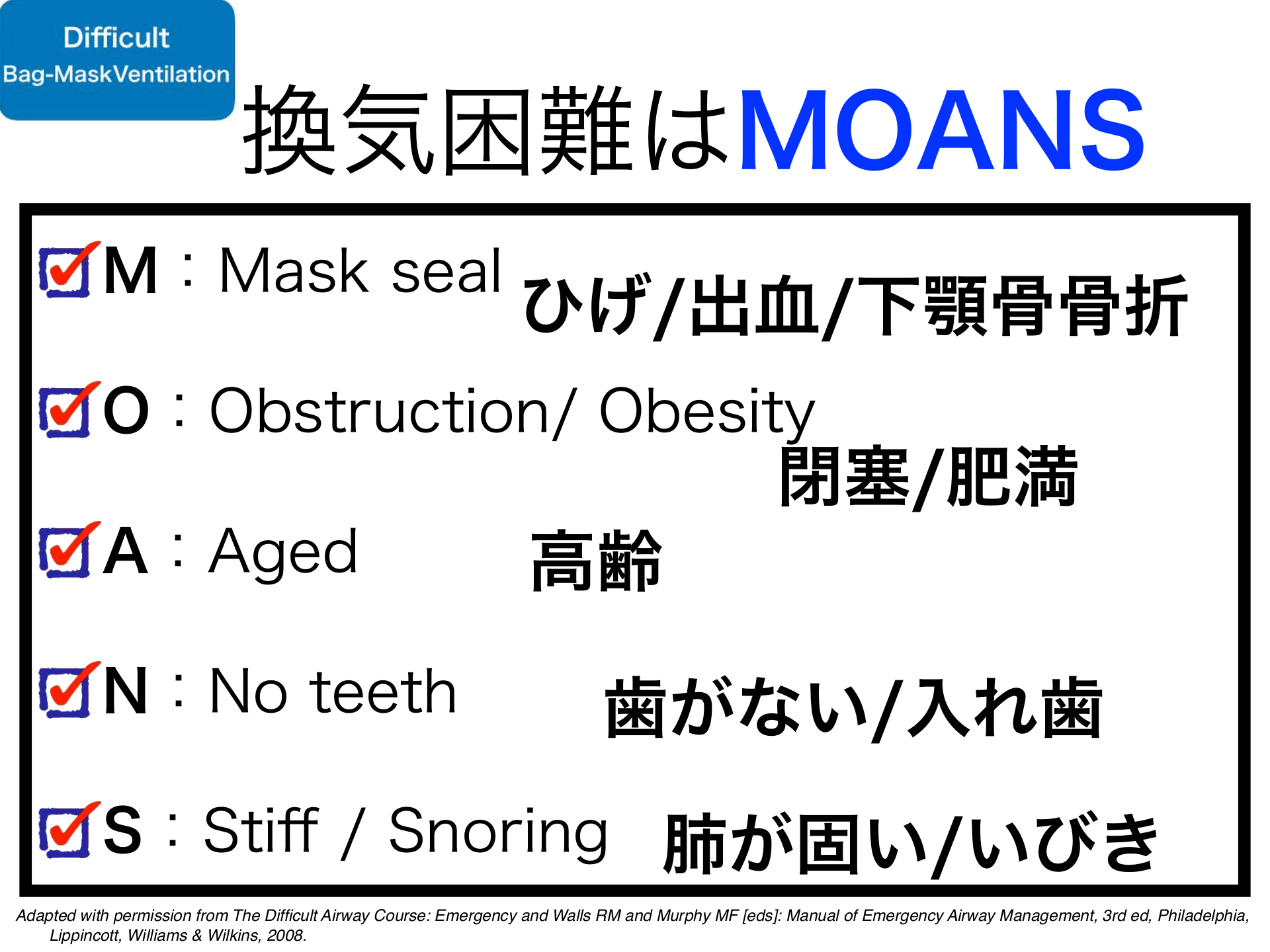 #67. 換気困難はMOANS M:Mask seal ひげ/出血/下顎骨骨折 O:Obstruction/ Obesity A:Aged N:No teeth 高齢 閉塞/肥満 歯がない/入れ歯 S:Stiff / Snoring 肺が固い/いびき Adapted with permission from The Difficult Airway Course: Emergency and Walls RM and Murphy MF [eds]: Manual of Emergency Airway Management, 3rd ed, Philadelphia, Lippincott, Williams & Wilkins, 2008.
