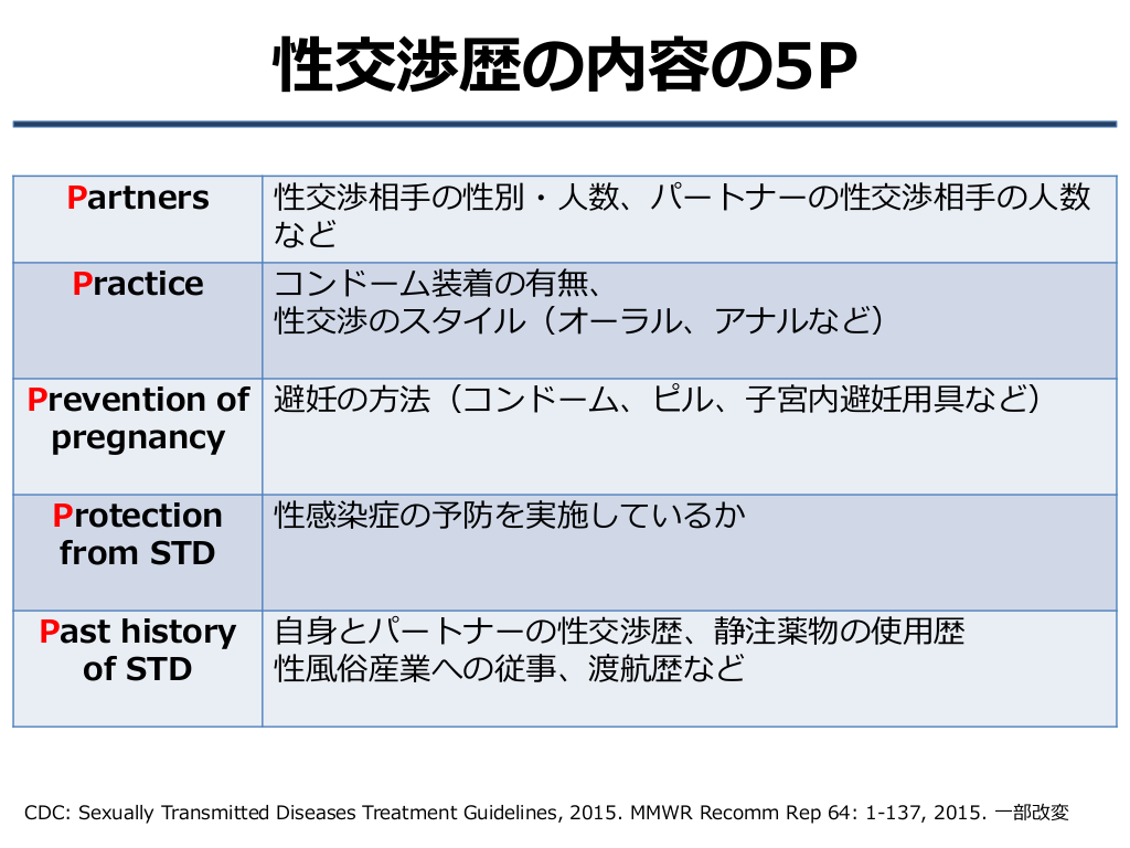 #10. 性交渉歴の内容の5P Partners 性交渉相手の性別・人数、パートナーの性交渉相手の人数 など Practice コンドーム装着の有無、 性交渉のスタイル(オーラル、アナルなど) Prevention of 避妊の方法(コンドーム、ピル、子宮内避妊用具など) pregnancy Protection from STD Past history of STD 性感染症の予防を実施しているか 自身とパートナーの性交渉歴、静注薬物の使用歴 性風俗産業への従事、渡航歴など CDC: Sexually Transmitted Diseases Treatment Guidelines, 2015. MMWR Recomm Rep 64: 1-137, 2015. 一部改変