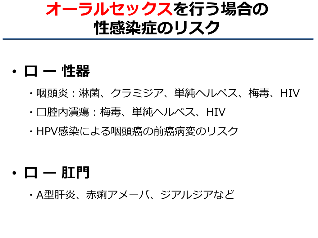 #11. オーラルセックスを行う場合の 性感染症のリスク • 口 ー 性器 ・咽頭炎:淋菌、クラミジア、単純ヘルペス、梅毒、HIV ・口腔内潰瘍:梅毒、単純へルペス、HIV ・HPV感染による咽頭癌の前癌病変のリスク • 口 ー 肛門 ・A型肝炎、赤痢アメーバ、ジアルジアなど