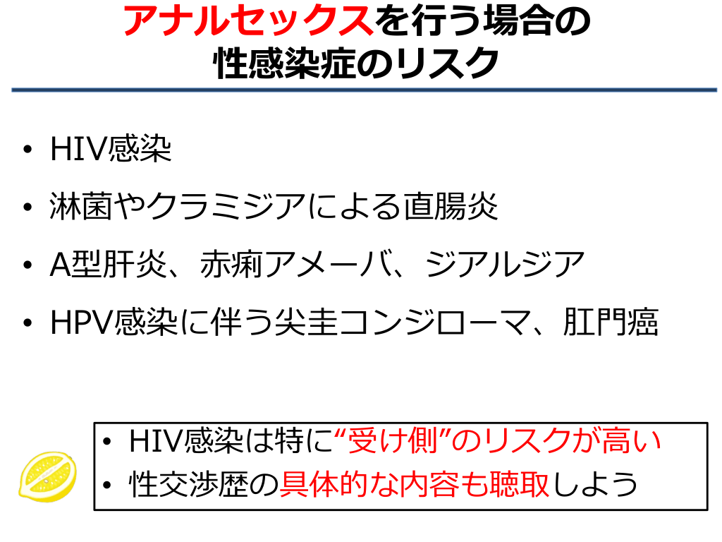 #12. アナルセックスを行う場合の 性感染症のリスク • HIV感染 • 淋菌やクラミジアによる直腸炎 • A型肝炎、赤痢アメーバ、ジアルジア • HPV感染に伴う尖圭コンジローマ、肛門癌 • HIV感染は特に“受け側”のリスクが高い • 性交渉歴の具体的な内容も聴取しよう