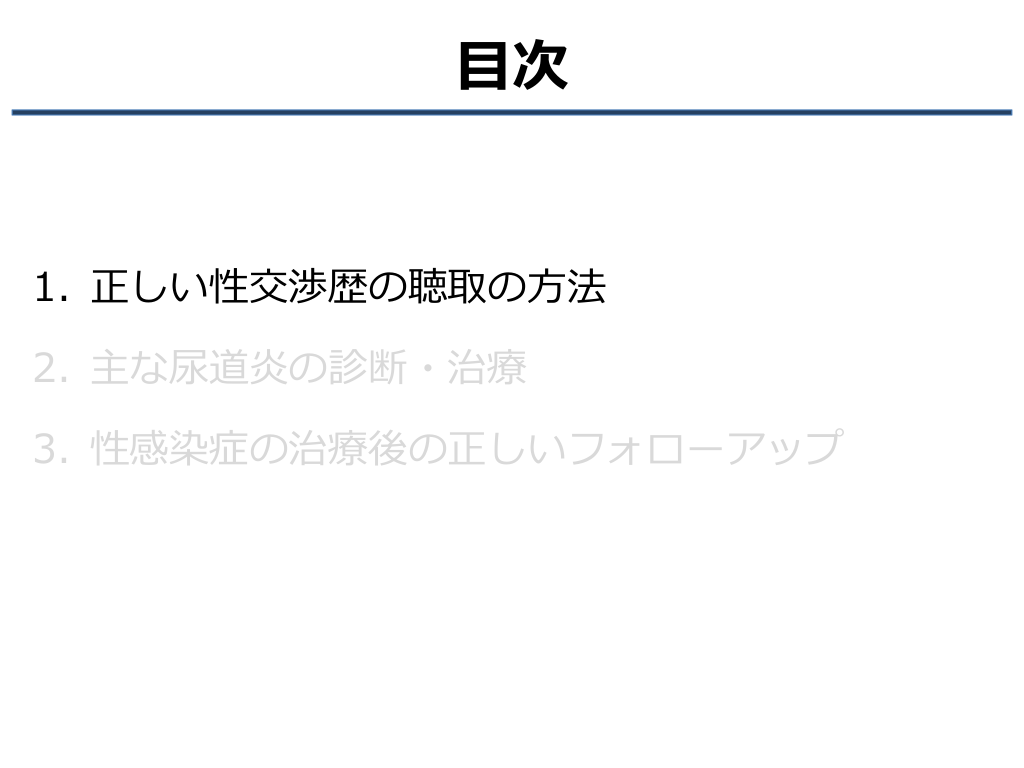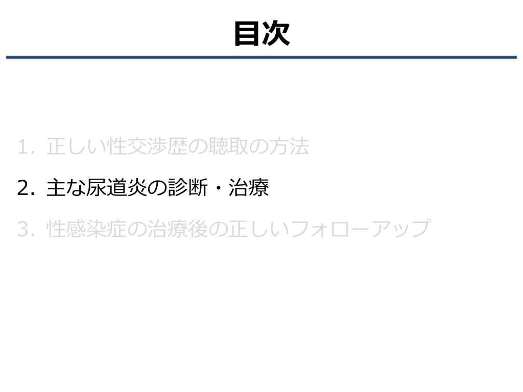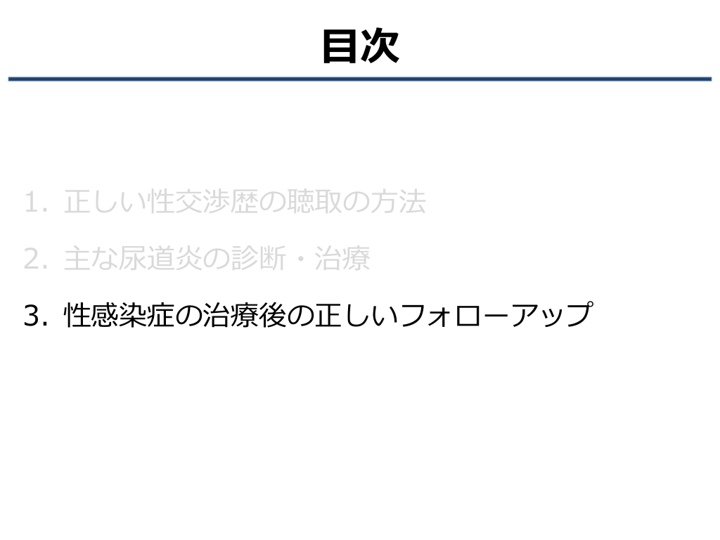 #5. 目次 1. 正しい性交渉歴の聴取の方法 2. 主な尿道炎の診断・治療 3. 性感染症の治療後の正しいフォローアップ