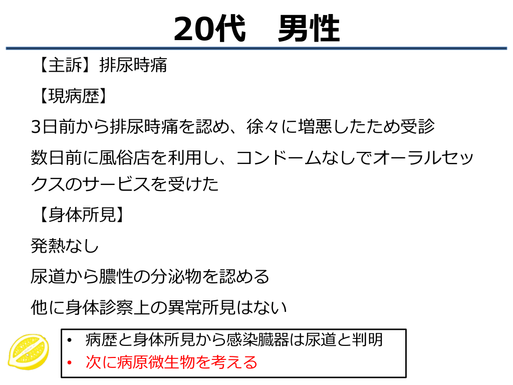 #14. 【主訴】排尿時痛 20代 男性 【現病歴】 3日前から排尿時痛を認め、徐々に増悪したため受診 数日前に風俗店を利用し、コンドームなしでオーラルセッ クスのサービスを受けた 【身体所見】 発熱なし 尿道から膿性の分泌物を認める 他に身体診察上の異常所見はない • 病歴と身体所見から感染臓器は尿道と判明 • 次に病原微生物を考える