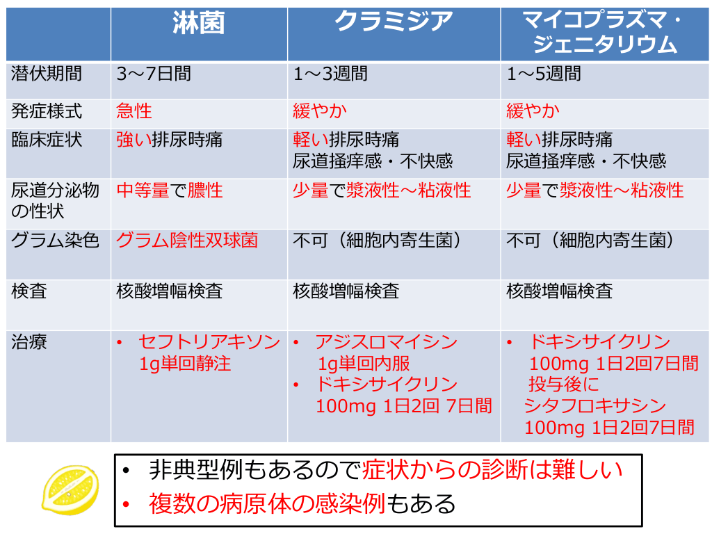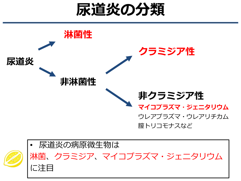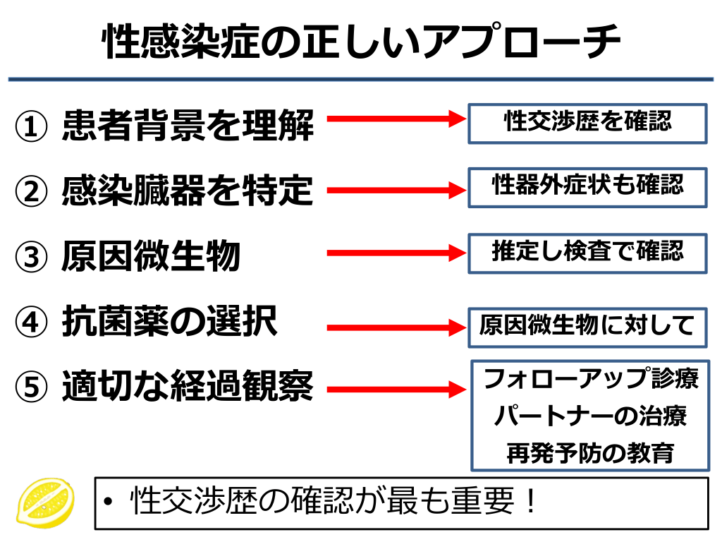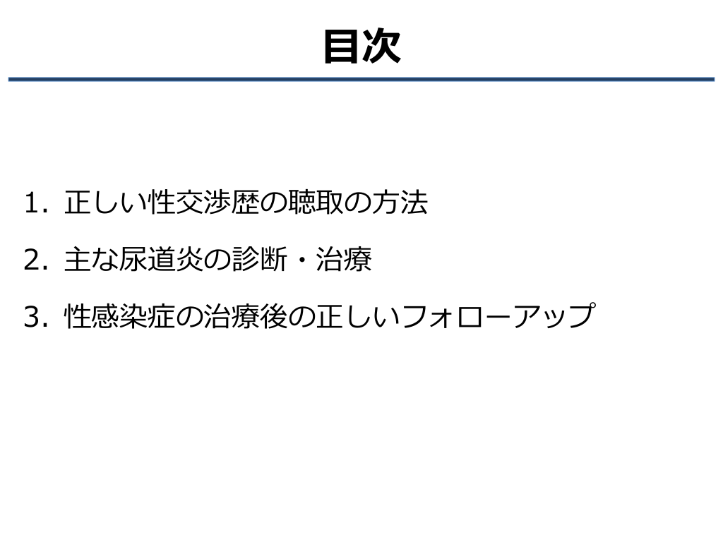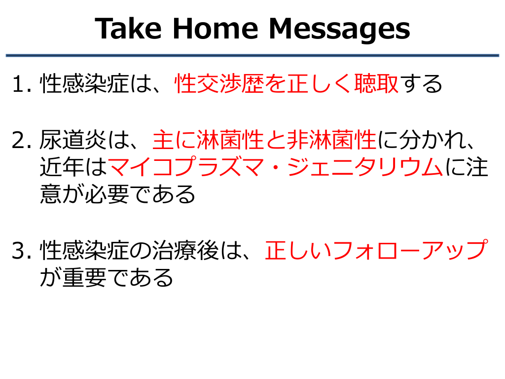 #2. Take Home Messages 1. 性感染症は、性交渉歴を正しく聴取する 2. 尿道炎は、主に淋菌性と非淋菌性に分かれ、 近年はマイコプラズマ・ジェニタリウムに注 意が必要である 3. 性感染症の治療後は、正しいフォローアップ が重要である