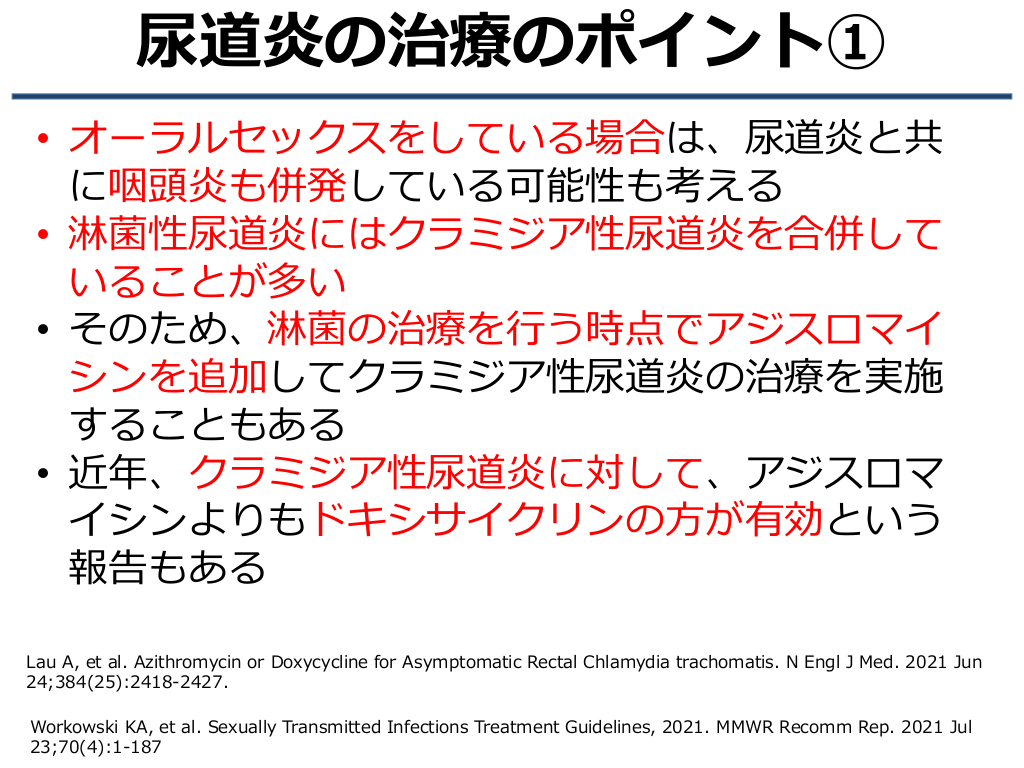 #17. 尿道炎の治療のポイント① • オーラルセックスをしている場合は、尿道炎と共 に咽頭炎も併発している可能性も考える • 淋菌性尿道炎にはクラミジア性尿道炎を合併して いることが多い • そのため、淋菌の治療を行う時点でアジスロマイ シンを追加してクラミジア性尿道炎の治療を実施 することもある • 近年、クラミジア性尿道炎に対して、アジスロマ イシンよりもドキシサイクリンの方が有効という 報告もある Lau A, et al. Azithromycin or Doxycycline for Asymptomatic Rectal Chlamydia trachomatis. N Engl J Med. 2021 Jun 24;384(25):2418-2427. Workowski KA, et al. Sexually Transmitted Infections Treatment Guidelines, 2021. MMWR Recomm Rep. 2021 Jul 23;70(4):1-187