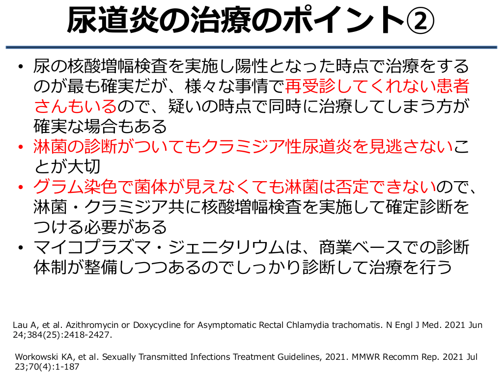 #18. 尿道炎の治療のポイント② • 尿の核酸増幅検査を実施し陽性となった時点で治療をする のが最も確実だが、様々な事情で再受診してくれない患者 さんもいるので、疑いの時点で同時に治療してしまう方が 確実な場合もある • 淋菌の診断がついてもクラミジア性尿道炎を見逃さないこ とが大切 • グラム染色で菌体が見えなくても淋菌は否定できないので、 淋菌・クラミジア共に核酸増幅検査を実施して確定診断を つける必要がある • マイコプラズマ・ジェニタリウムは、商業ベースでの診断 体制が整備しつつあるのでしっかり診断して治療を行う Lau A, et al. Azithromycin or Doxycycline for Asymptomatic Rectal Chlamydia trachomatis. N Engl J Med. 2021 Jun 24;384(25):2418-2427. Workowski KA, et al. Sexually Transmitted Infections Treatment Guidelines, 2021. MMWR Recomm Rep. 2021 Jul 23;70(4):1-187