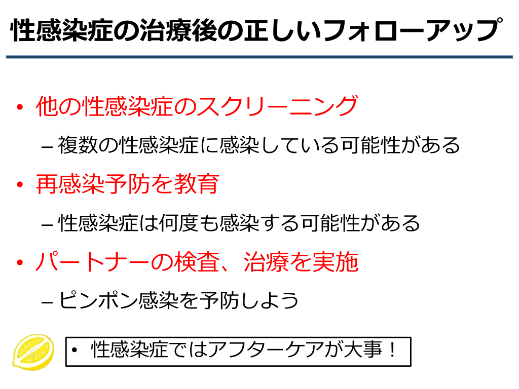 #20. 性感染症の治療後の正しいフォローアップ • 他の性感染症のスクリーニング – 複数の性感染症に感染している可能性がある • 再感染予防を教育 – 性感染症は何度も感染する可能性がある • パートナーの検査、治療を実施 – ピンポン感染を予防しよう • 性感染症ではアフターケアが大事!