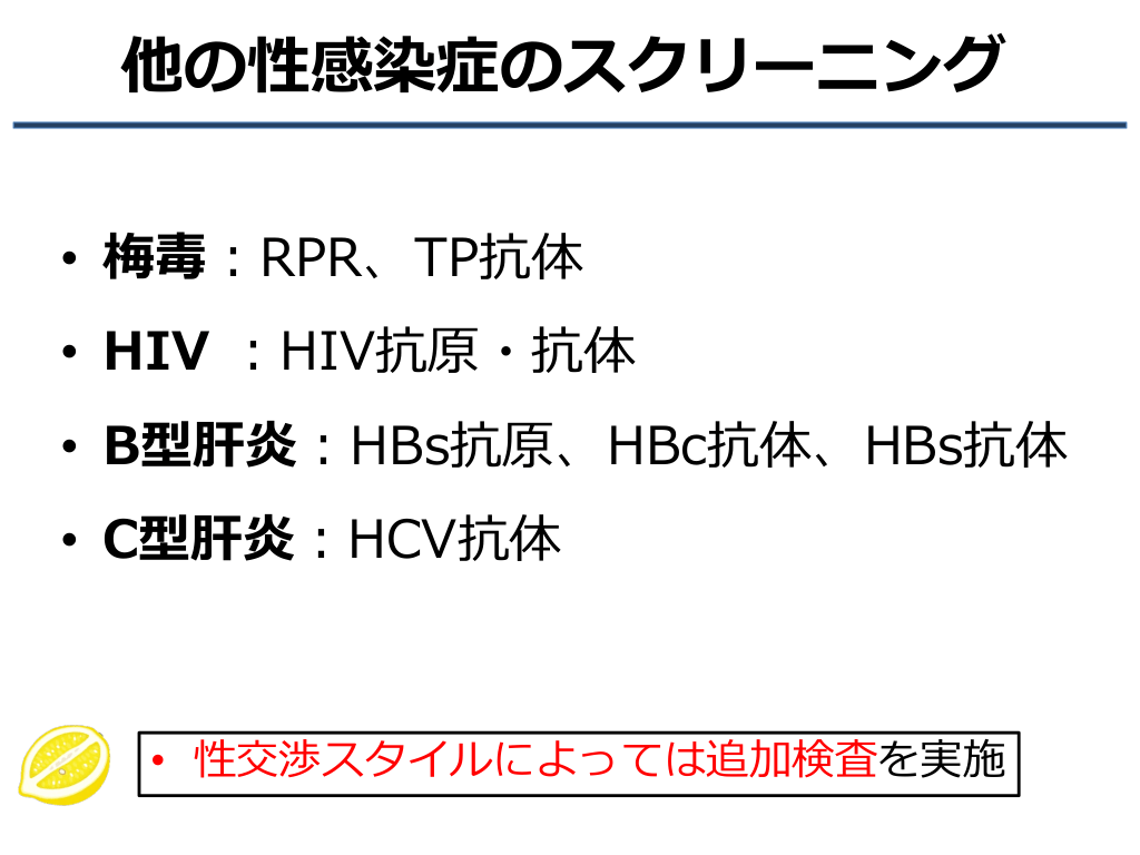 #21. 他の性感染症のスクリーニング • 梅毒:RPR、TP抗体 • HIV :HIV抗原・抗体 • B型肝炎:HBs抗原、HBc抗体、HBs抗体 • C型肝炎:HCV抗体 • 性交渉スタイルによっては追加検査を実施