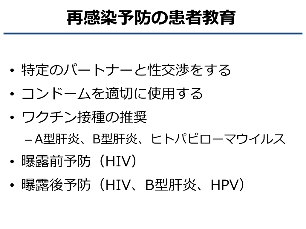 #22. 再感染予防の患者教育 • 特定のパートナーと性交渉をする • コンドームを適切に使用する • ワクチン接種の推奨 – A型肝炎、B型肝炎、ヒトパピローマウイルス • 曝露前予防(HIV) • 曝露後予防(HIV、B型肝炎、HPV)