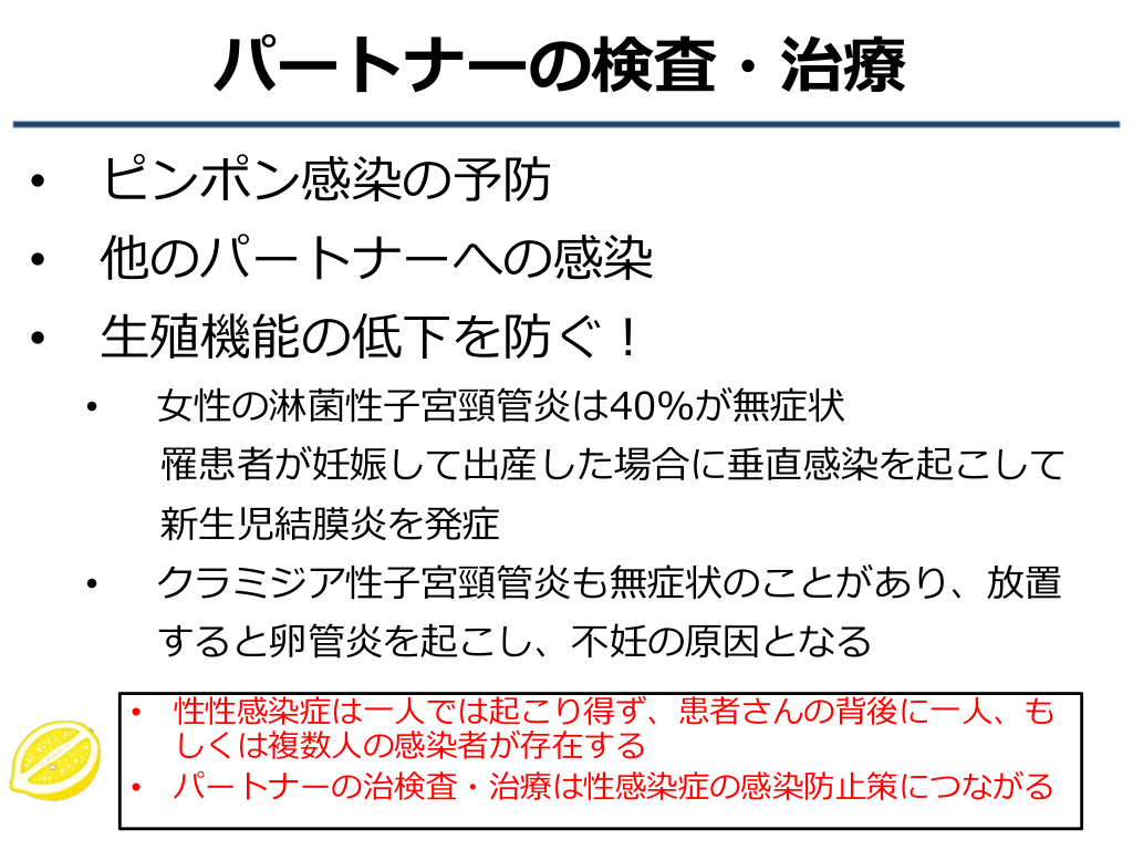 #23. パートナーの検査・治療 • ピンポン感染の予防 • 他のパートナーへの感染 • 生殖機能の低下を防ぐ! • 女性の淋菌性子宮頸管炎は40%が無症状 罹患者が妊娠して出産した場合に垂直感染を起こして 新生児結膜炎を発症 • クラミジア性子宮頸管炎も無症状のことがあり、放置 すると卵管炎を起こし、不妊の原因となる • 性性感染症は一人では起こり得ず、患者さんの背後に一人、も しくは複数人の感染者が存在する • パートナーの治検査・治療は性感染症の感染防止策につながる
