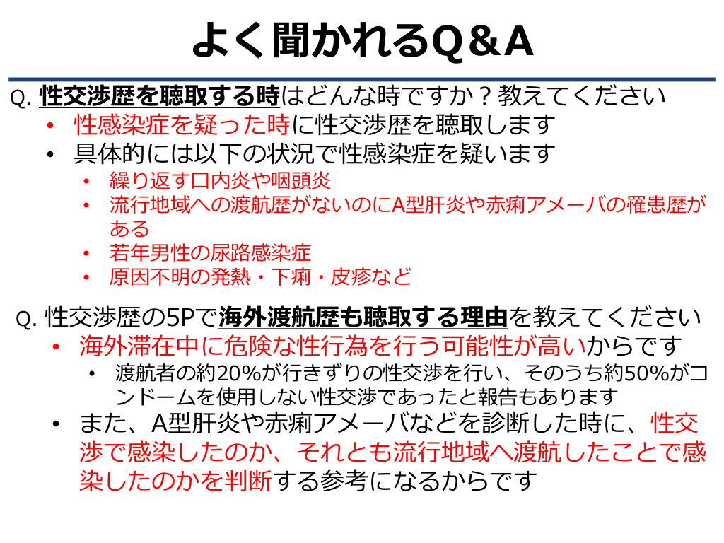 #24. よく聞かれるQ&A Q. 性交渉歴を聴取する時はどんな時ですか?教えてください • 性感染症を疑った時に性交渉歴を聴取します • 具体的には以下の状況で性感染症を疑います • 繰り返す口内炎や咽頭炎 • 流行地域への渡航歴がないのにA型肝炎や赤痢アメーバの罹患歴が ある • 若年男性の尿路感染症 • 原因不明の発熱・下痢・皮疹など Q. 性交渉歴の5Pで海外渡航歴も聴取する理由を教えてください • 海外滞在中に危険な性行為を行う可能性が高いからです • 渡航者の約20%が行きずりの性交渉を行い、そのうち約50%がコ ンドームを使用しない性交渉であったと報告もあります • また、A型肝炎や赤痢アメーバなどを診断した時に、性交 渉で感染したのか、それとも流行地域へ渡航したことで感 染したのかを判断する参考になるからです