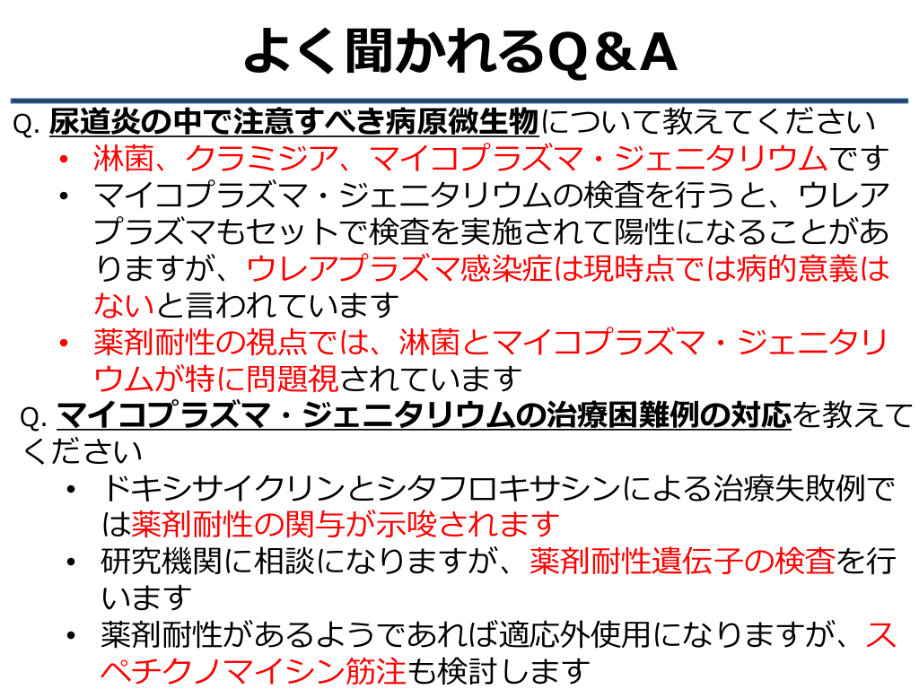 #25. よく聞かれるQ&A Q. 尿道炎の中で注意すべき病原微生物について教えてください • 淋菌、クラミジア、マイコプラズマ・ジェニタリウムです • マイコプラズマ・ジェニタリウムの検査を行うと、ウレア プラズマもセットで検査を実施されて陽性になることがあ りますが、ウレアプラズマ感染症は現時点では病的意義は ないと言われています • 薬剤耐性の視点では、淋菌とマイコプラズマ・ジェニタリ ウムが特に問題視されています Q. マイコプラズマ・ジェニタリウムの治療困難例の対応を教えて ください • ドキシサイクリンとシタフロキサシンによる治療失敗例で は薬剤耐性の関与が示唆されます • 研究機関に相談になりますが、薬剤耐性遺伝子の検査を行 います • 薬剤耐性があるようであれば適応外使用になりますが、ス ペチクノマイシン筋注も検討します