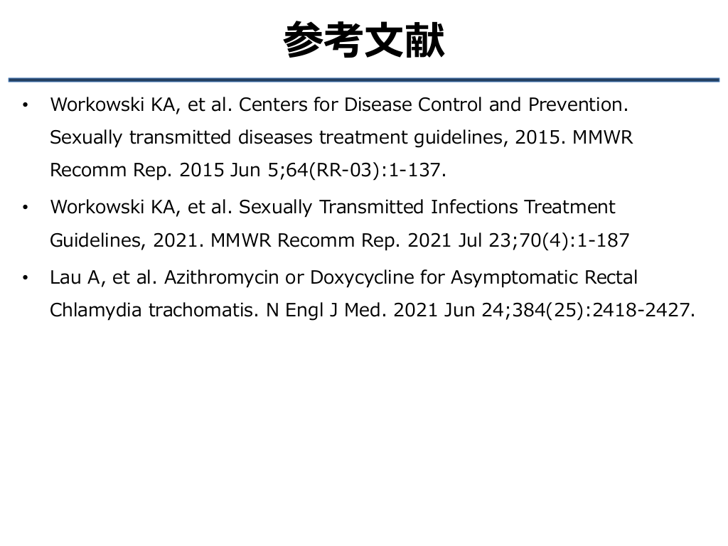 #27. 参考文献 • Workowski KA, et al. Centers for Disease Control and Prevention. Sexually transmitted diseases treatment guidelines, 2015. MMWR Recomm Rep. 2015 Jun 5;64(RR-03):1-137. • Workowski KA, et al. Sexually Transmitted Infections Treatment Guidelines, 2021. MMWR Recomm Rep. 2021 Jul 23;70(4):1-187 • Lau A, et al. Azithromycin or Doxycycline for Asymptomatic Rectal Chlamydia trachomatis. N Engl J Med. 2021 Jun 24;384(25):2418-2427.