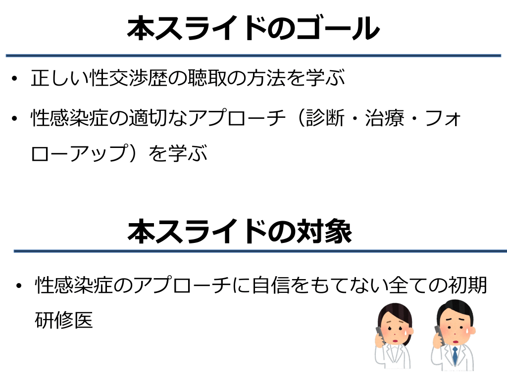 #3. 本スライドのゴール • 正しい性交渉歴の聴取の方法を学ぶ • 性感染症の適切なアプローチ(診断・治療・フォ ローアップ)を学ぶ 本スライドの対象 • 性感染症のアプローチに自信をもてない全ての初期 研修医