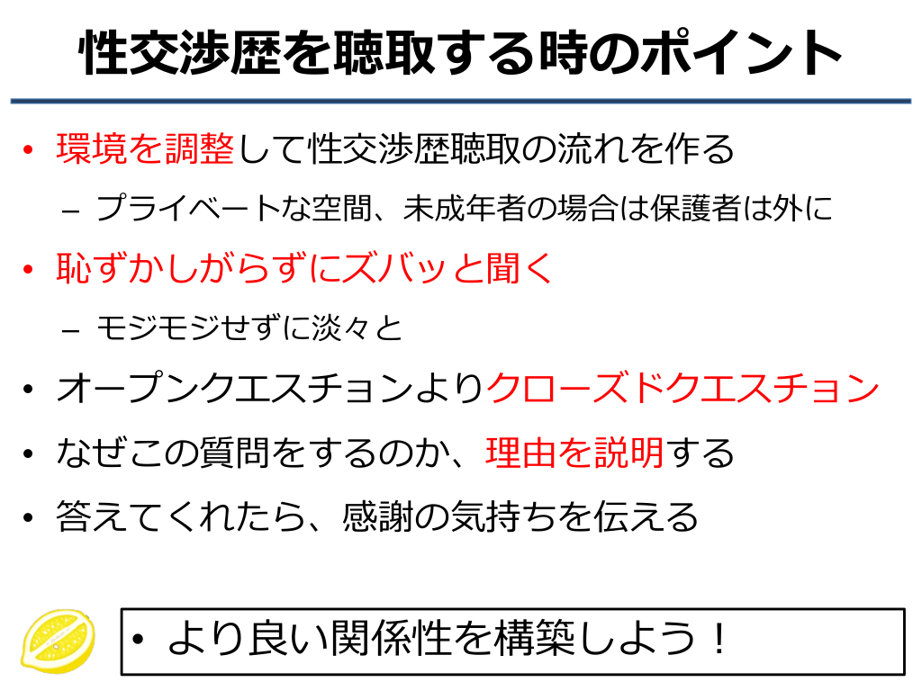 #9. 性交渉歴を聴取する時のポイント • 環境を調整して性交渉歴聴取の流れを作る – プライベートな空間、未成年者の場合は保護者は外に • 恥ずかしがらずにズバッと聞く – モジモジせずに淡々と • オープンクエスチョンよりクローズドクエスチョン • なぜこの質問をするのか、理由を説明する • 答えてくれたら、感謝の気持ちを伝える • より良い関係性を構築しよう!
