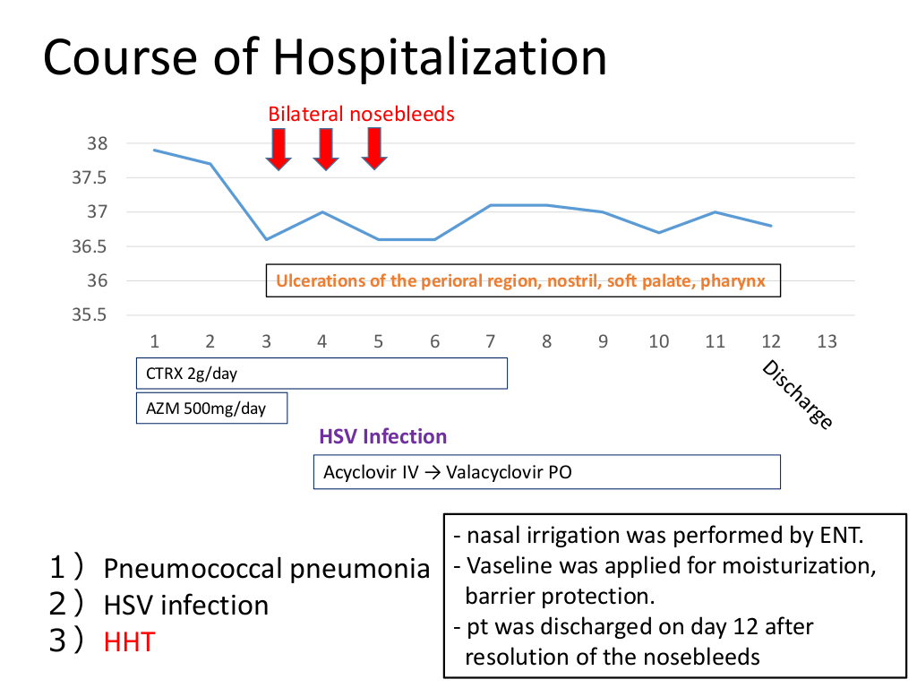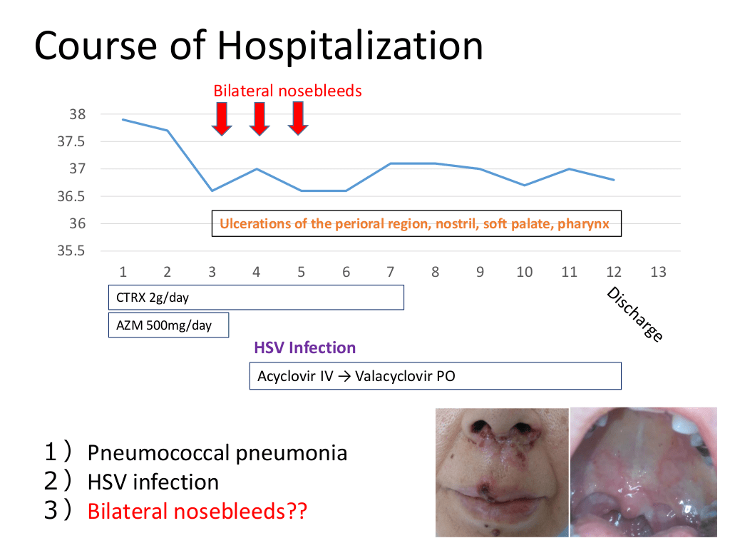 #10. Course of Hospitalization Bilateral nosebleeds 38 37.5 37 36.5 36 Ulcerations of the perioral region, nostril, soft palate, pharynx 35.5 1 2 3 4 5 6 7 8 CTRX 2g/day AZM 500mg/day HSV Infection Acyclovir IV → Valacyclovir PO 1)Pneumococcal pneumonia 2)HSV infection 3)Bilateral nosebleeds?? 9 10 11 12 13